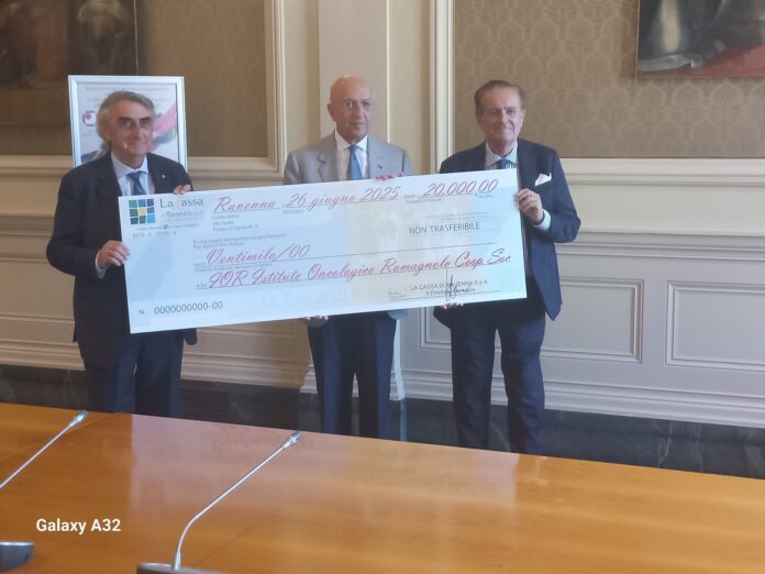 Il Presidente del Gruppo Bancario La Cassa di Ravenna Antonio Patuelli ed il Direttore Generale Nicola Sbrizzi hanno consegnato al Vice Presidente dell’Istituto Oncologico Romagnolo, Mario Pretolani, l’assegno da 20 mila euro che la Cassa destina allo Ior a conclusione del collocamento dell’obbligazione triennale lanciata dalle tre banche del Gruppo, ovvero La Cassa di Ravenna, Banca di Imola e Banco di Lucca e del Tirreno, per sostenere l’attività dell’Istituto Oncologico.