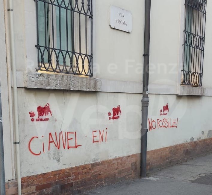 “Scritte enormi rosse sono comparse sui muri del centro storico contro il fossile e in specifico contro Eni (in allegato 2 foto).