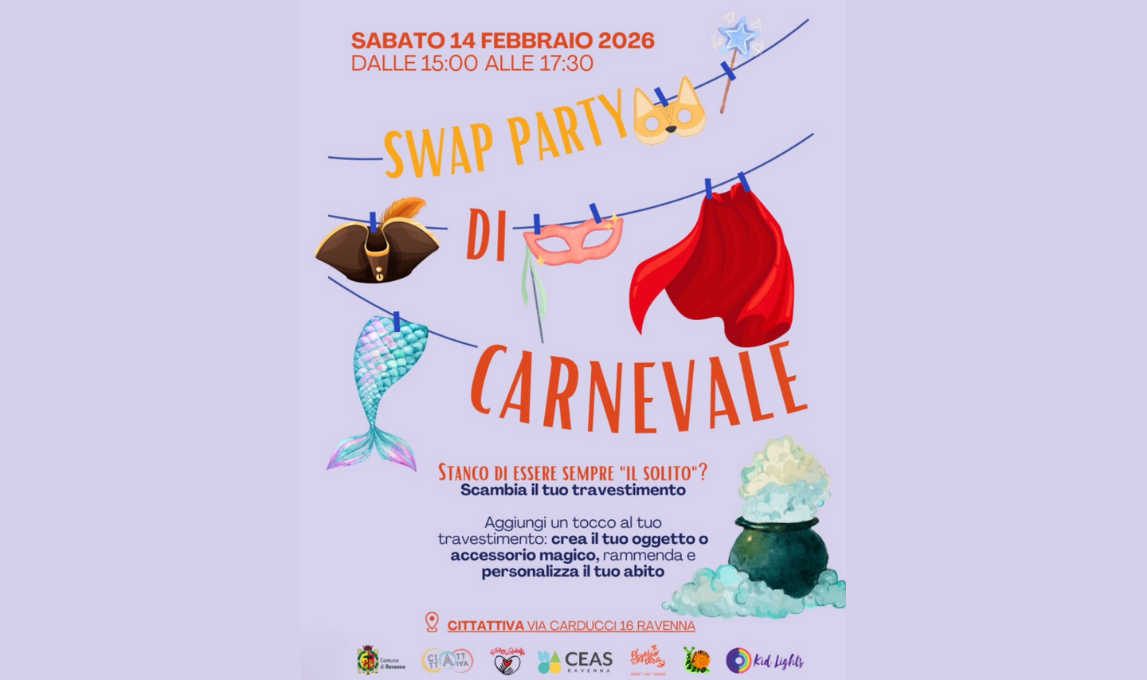 Appuntamento con il Carnevale all’insegna del riuso sabato 14 febbraio dalle 15 alle 17.30 nella sede di CittAttiva Ravenna, in via Carducci 16. Torna infatti lo swap party dedicato ai costumi, un pomeriggio pensato per bambini dai 3 anni in su e per tutti i ragazzi che vogliono sperimentare, divertirsi e dare spazio alla creatività.