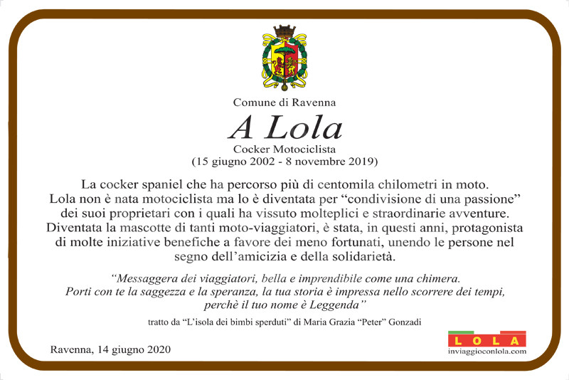 Questa mattina nell’area verde antistante la Basilica di Sant’Apollinare in Classe, si è svolta la cerimonia di scopertura della targa in memoria di Lola, l’indimenticata cockerina motociclista, che il Comune di Ravenna aveva apposto un anno fa ma che era stata rinviata a causa dell’emergenza sanitaria.