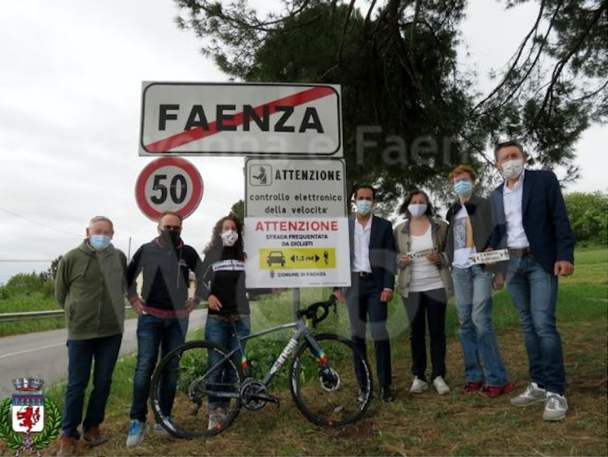 Questa mattina Paola Gianotti ha fatto tappa a Faenza per fare da testimonial all’iniziativa. Con lei in rappresentanza della città c’era l’assessore allo sport Martina Laghi, Massimo Bosi, assessore alla viabilità, il consigliere, capogruppo e vicepresidente della commissione Sport, Alessio Grillini, Alvaro Vanni, responsabile del progetto a faenza per la sicurezza dei ciclisti e l’ex ciclista professionista Renato Laghi. Durante il breve momento uno dei cartelli di sensibilizzazione nei confronti degli automobilisti è stato affisso alle porte della città, lungo la provinciale brisighellese, all’altezza del parcheggio dell’Istituto scolastico di agraria del Persolino.