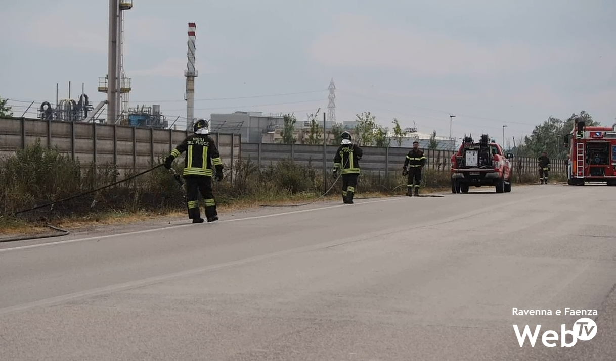 Il rogo è scaturito ai piedi di un muro di recinzione che divide la strada da alcuni serbatoi gpl di una delle tante aziende del polo chimico ravennate. La circostanza ha complicato l’intervento dei Vigili del Fuoco.