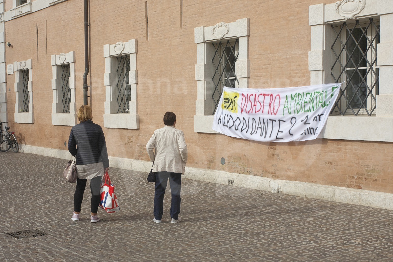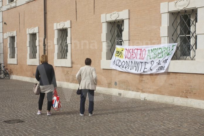 Uno striscione di protesta per la subsidenza a Lido di Dante a Palazzo Rasponi. Mentre all’interno di Palazzo Rasponi andava in scena il convegno “Quale futuro turistico-ambientale per Lido di Dante ?” Organizzato dalla pro loco della stessa località, in piazza Kennedy, sul muro del prezioso edificio, è comparso lo striscione, affisso da ignoti.