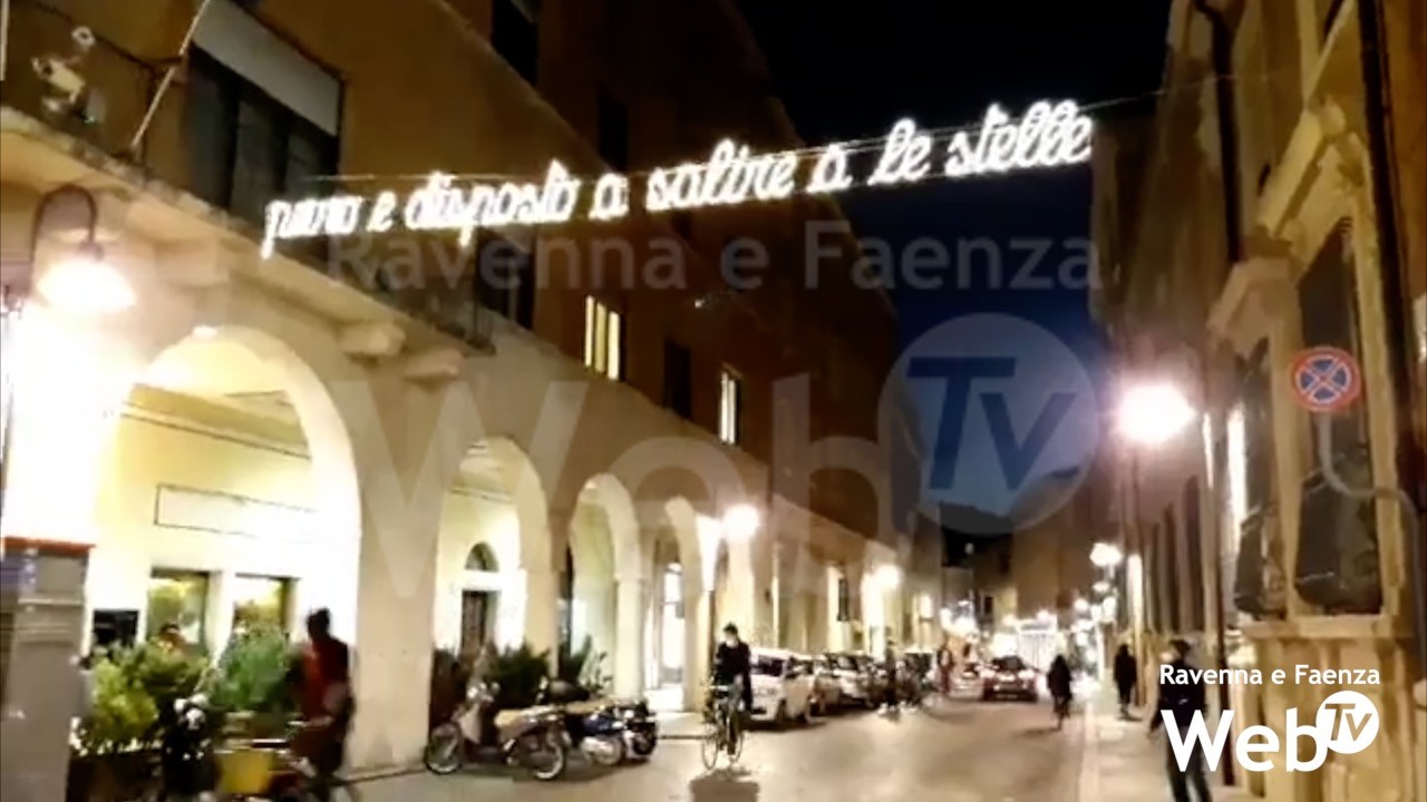 Nel pomeriggio di venerdì, alle 19, sono state accese le luminarie di Dante. “La luce delle parole” anteprima del progetto natalizio che coinvolgerà Ravenna. Si è trattata di una prova in vista dell’accensione ufficiale durante la Notte per Dante di sabato. Le luminarie con scritto i versi della Divina Commedia sono state installate nelle vie Corrado Ricci, Mazzini e Gordini