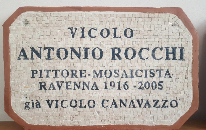 Lunedì 18 settembre alle ore 11, alla presenza del vicesindaco del Comune di Ravenna Eugenio Fusignani verrà intitolato ad Antonio Rocchi un vicolo del borgo San Biagio che congiunge via Portone con via Rampina con la installazione di due targhe in mosaico bizantino ravennate di smalto vetroso e materiale lapideo su supporti in terracotta realizzate nel Laboratorio dell’Associazione Dis-ORDINE dalle mosaiciste Sofia Laghi, Marianna Luordo, Isabella Merendi e Francesca Sansavini con il coordinamento di Elena Pagani e Marcello Landi, il supporto tecnico di Edoardo Missiroli e il contributo dei maestri scultori Mirta Morigi e Mauro Bartolotti.