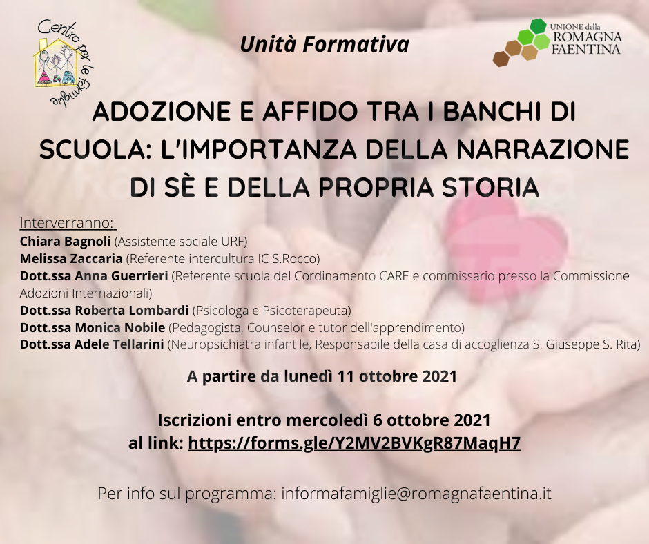 Dal dialogo fra Scuola, Centro per le Famiglie e Assessorati al Welfare dell’Unione Romagna Faentina è nato il progetto formativo “Adozione e affido fra i banchi di scuola: l’importanza della narrazione di sé”, rivolto a docenti di Scuola dell’Infanzia, Primaria e Secondaria di primo grado, educatori professionali dei nidi, operatori sociali e famiglie.