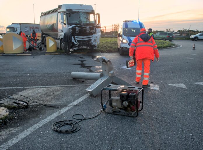 Incidente questa mattina alle 6.30 sulla Strada Statale Adriatica, un camion con rimorchio in direzione da sud verso nord, arrivato all’altezza della rotonda della Ravegnana ha tirato dritto ed ha abbattuto il pilone dell’illuminazione facendolo cadere dalla parte opposta senza fortunatamente colpire nessuno. Sul posto i Vigili del Fuoco e gli operatori del 118, fortunatamente il camionista è rimasto illeso. Diverse le pattuglie della Polizia locale per la gestione del traffico, la corsia nord era completamente bloccata. Sul posto anche gli uomini dell’ANAS per liberare la sede stradale. Pesanti ripercussioni sul traffico nelle due corsie dell’Adriatica.