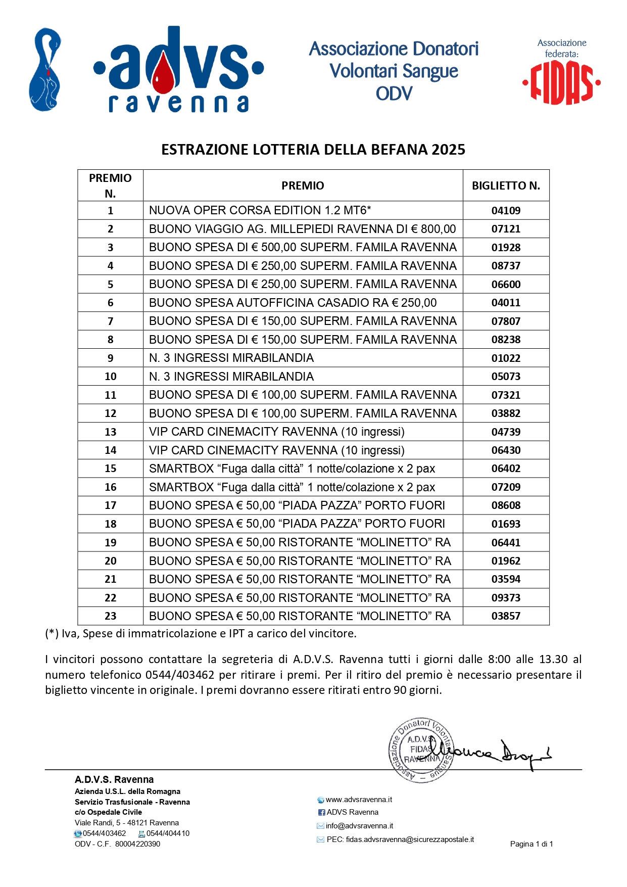 “Alle 17:00 è poi seguita la nostra tradizionale estrazione della Lotteria della Befana – spiega Flavio Vichi, Responsabile della Comunicazione di A.D.V.S. Ravenna – come sempre a sostegno della nostra mission principale, che è quella di avvicinare tante persone alla donazione di sangue e plasma, un buon proposito per questo nuovo 2025. Un gesto salvavita necessario e insostituibile. Invitiamo tutti i ravennati che vogliano iniziare a donare il sangue, a venirci a trovare al Servizio Trasfusionale dell’Ospedale di Ravenna, tutti i giorni dalle 8 alle 10.30.”