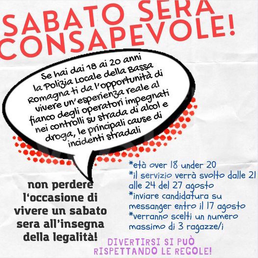 La Polizia Locale della Bassa Romagna ha lanciato un’opportunità per i giovani residenti nel nostro territorio: Passare un sabato sera alternativo all’insegna della legalità.