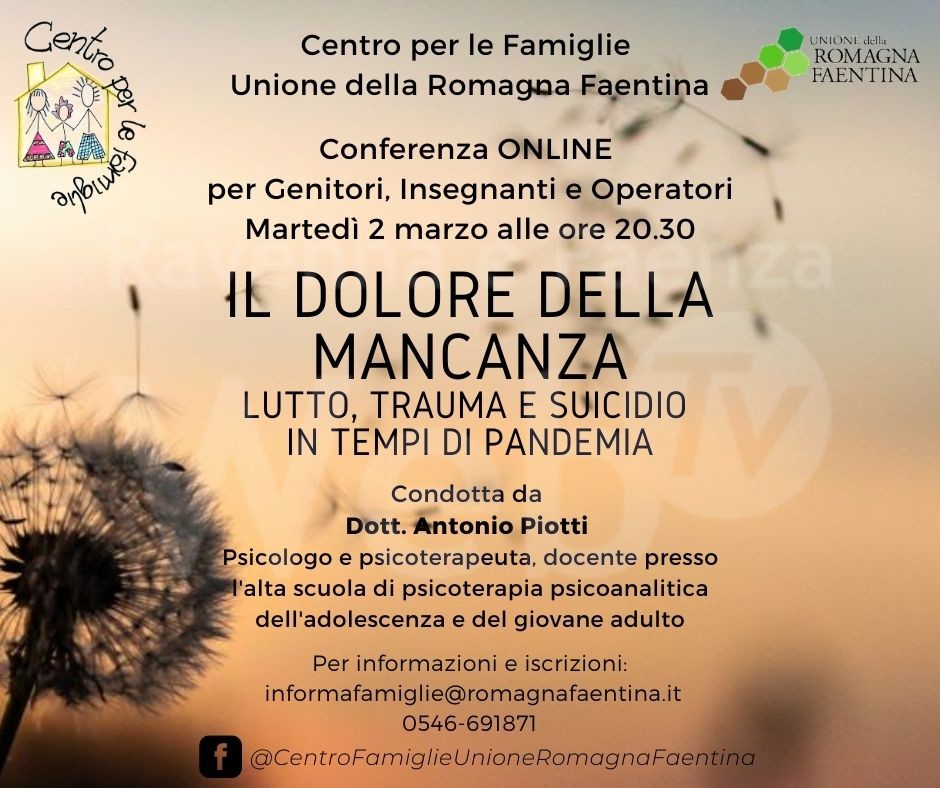 Per riflettere su un argomento tanto importante quanto delicato, il Centro per le Famiglie organizza la conferenza online “Il dolore della mancanza: lutto, trauma e suicidio al tempo della pandemia” condotta dal Dott. Antonio Piotti (psicologo e psicoterapeuta, docente presso l’Alta Scuola di psicoterapia analitica dell’adolescenza e del giovane adulto).