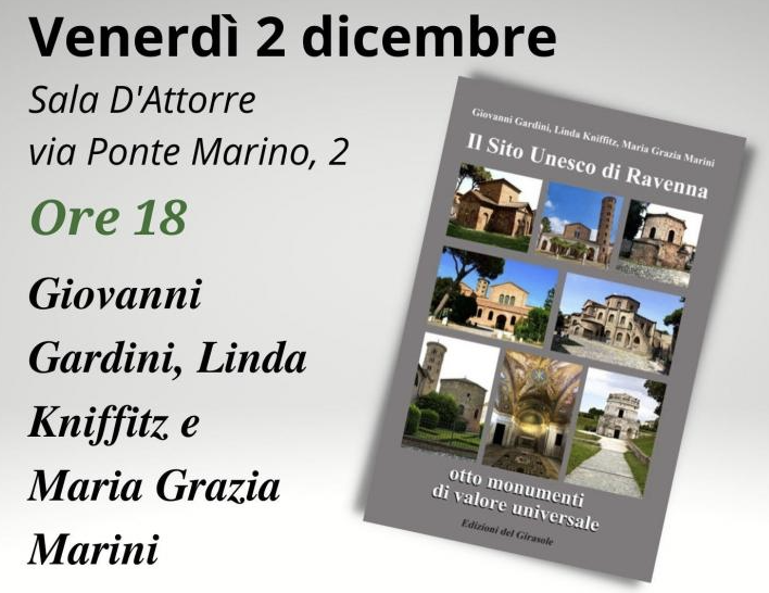 Venerdì 2 dicembre, alle 18, nella sala D’Attorre di via Ponte Marino, 2, per il XLIX ciclo degli Incontri Letterari del Centro Relazioni Culturali, si terrà la presentazione del libro di Giovanni Gardini, Linda Kniffitz e Maria Grazia Marini “Il Sito Unesco di Ravenna. Otto monumenti di valore universale”, Edizioni Il Girasole.