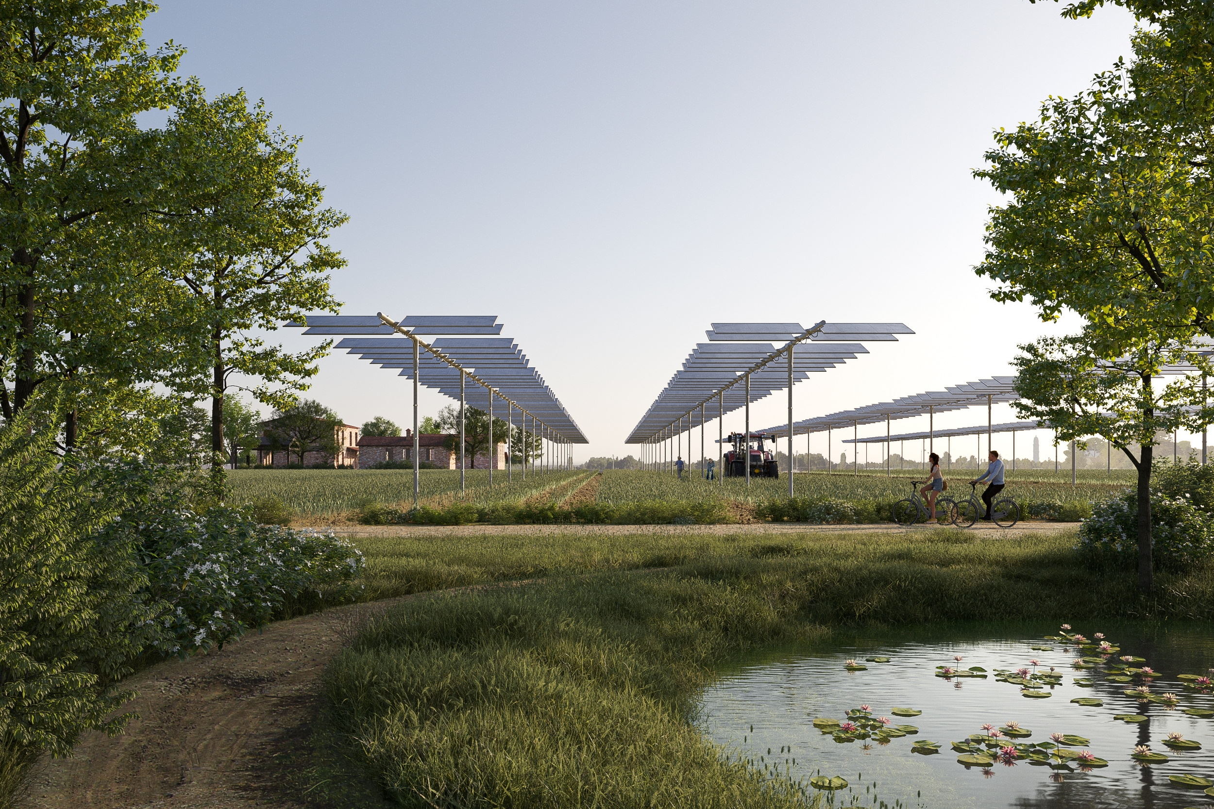 Gli attori coinvolti nel progetto – Comune di Faenza, Gruppo Hera con Studio LBLA, Unione della Romagna Faentina e la Società Agricola Le Cicogne, partecipata da Crédit Agricole e dalla Fondazione Banca del Monte e Cassa di Risparmio di Faenza – hanno ipotizzato di destinare circa un terzo della superficie alla produzione di energia contestuale alla coltivazione agricola, un terzo all’agricoltura in campo aperto e un terzo alla urban forest. In questa nuova infrastruttura green, l’agrivoltaico associato all’agricoltura di precisione utilizzerà tecniche digitali per monitorare e ottimizzare i processi di produzione agricola, riducendone l’impatto ambientale: l’impianto sarà costituito da strutture di sostegno dei pannelli fotovoltaici posizionate ad una altezza da terra che permette il passaggio dei mezzi agricoli utilizzati per la coltivazione. Questi sistemi consentono di ridurre al minimo l’occupazione di suolo, permettendo la coltivazione del 90-95% dei terreni sui quali sono installati. Il funzionamento di questi impianti è, inoltre, a inseguimento solare: un dispositivo meccanico automatico orienta, infatti, i pannelli fotovoltaici nella direzione dei raggi solari. I pannelli fotovoltaici che saranno installati saranno poi bifacciali, ossia consentiranno di sfruttare la radiazione luminosa su entrambe le facce del modulo con l’obiettivo di massimizzare la generazione di energia elettrica. Si ipotizza, inoltre, l’installazione di adeguati sistemi di monitoraggio che permetteranno di verificare l’incidenza degli impianti sulla produzione agricola.