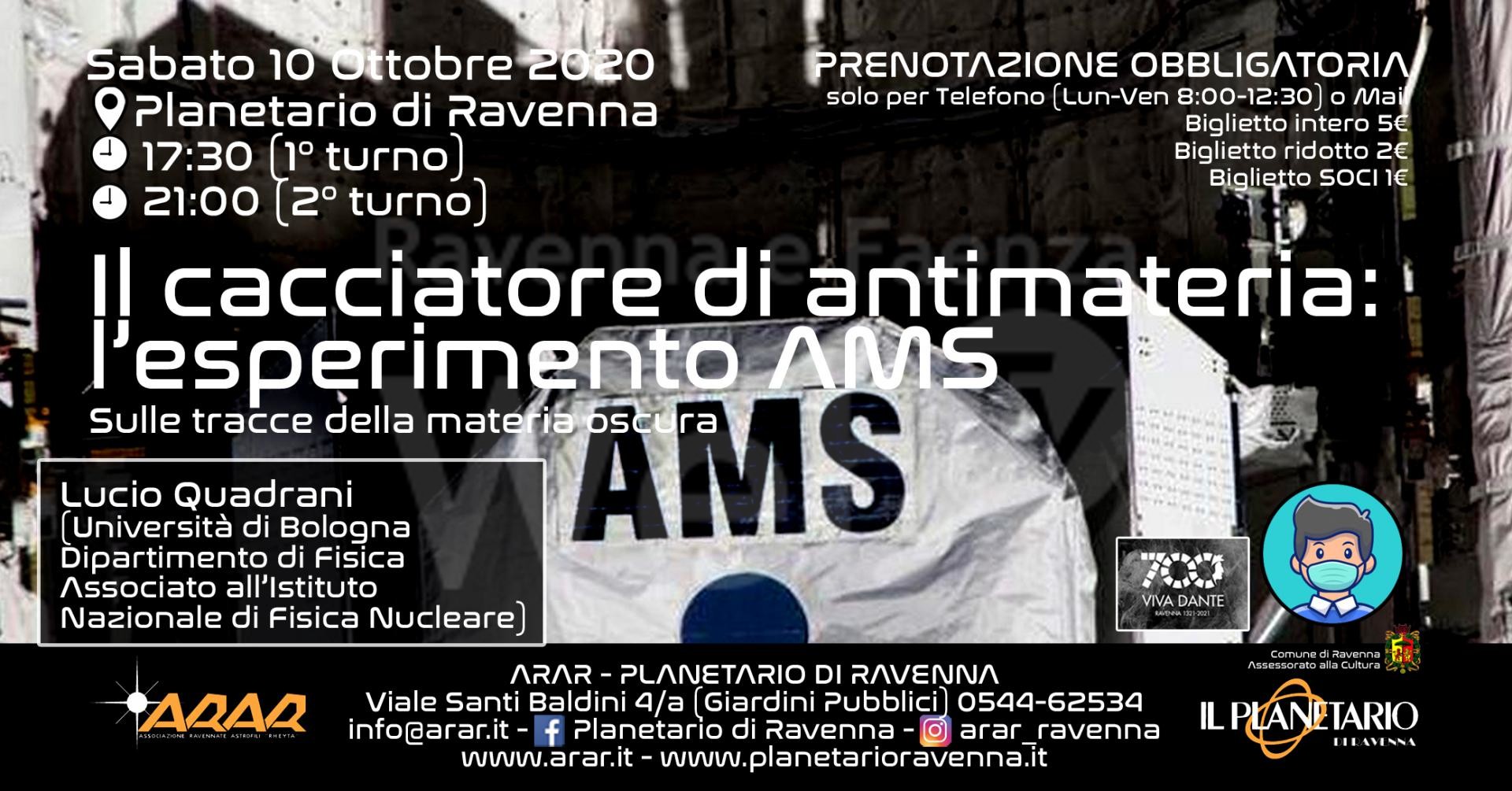 Sabato 10 ottobre 2020, in due turni (17:30 e 21:00), al Planetario di Ravenna sarà presente il Dott. Lucio Quadrani dell’Università di Bologna, Dipartimento di Fisica, Associato all’Istituto Nazionale di Fisica Nucleare. Ci parlerà e ci mostrerà immagini dell’esperimento AMS.