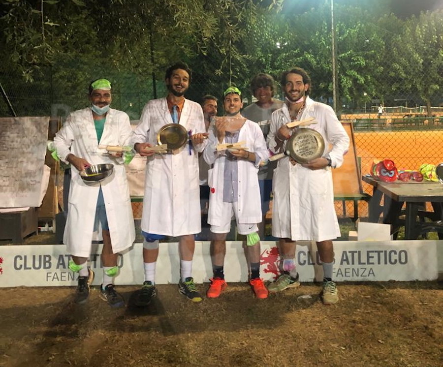 Spettacolo e divertimento ieri sera sui campi del Tennis Club Faenza, per il ritorno (dopo un anno d’assenza a causa del Covid) del torneo di tennis con le padelle. Ventidue squadre si sono affrontate in vari tabelloni, davanti ad un pubbico molto numeroso. Alla fine la vittoria assoluta è andata un po’ a sorpresa – ma forse quest’anno era destino così – ai “Virologi”, squadra formata da Lorenzo Liverani, Pietro Zoli, Giovanni Cicognani e Tommaso Tredozi, che nella finale hanno battuto i “Contadini”. Terzo posto per la “Dark Polo Gang”, quarti i “Blackmen”. Nella categoria femminile successo per “Le Nuove C”, team composto da Matilde Greco, Sofia Regina, Sandy Mamini, Virginia Lodi e Alessia Ercolino, che nella finale rosa ha prevalso sulle “Bagnine Salvavita”. Nel tabellone “non open” vittoria invece per i “Mucconi”. Il premio per il miglior costume, ambito quanto la vittoria sportiva, è stato attribuito ai “Makeskif”, parodia dei Maneskin, squadra formata da Alessandro Buti, Davide Farina, Michelangelo Naldini e Andrea Cannella. Secondo posto per “Il circolo degli artisti”, terza posizione per “La casa ad cherta”.