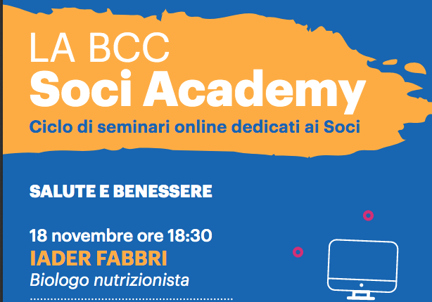 LA BCC Soci Academy è il nuovo progetto rivolto ai Soci de LA BCC. “Si tratta di uno spazio di formazione, informazione e condivisione in cui i Soci potranno apprendere contenuti e porre quesiti agli esperti che di volta in volta affronteranno i temi proposti – spiega Monia Valgimigli Responsabile dell’Ufficio Soci e Relazioni Esterne de LA BCC. – I seminari si svolgeranno online e i Soci potranno seguirli attraverso i canali social della Banca. In passato abbiamo proposto questo tipo di attività formative in presenza avendo riscontri di gradimento da parte della base sociale, oggi vogliamo offrire un nuovo format di contenuti digitali. Partiremo con seminari dedicati al benessere ed alla salute, temi sui quali i Soci dimostrano grande attenzione, come testimoniano le adesioni che in questi anni ha raccolto il Progetto Salute nell’ambito delle manifestazioni sociali.”