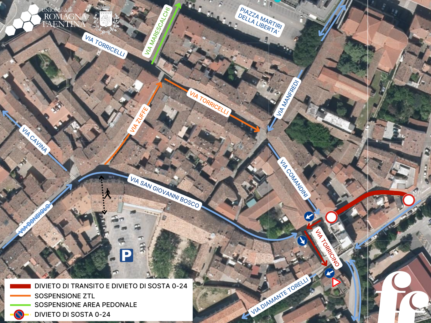Durante questo periodo, nella fascia oraria dalle 7.00 alle 18.00, sarà istituito il divieto di transito nel tratto compreso tra via Comandini e via Diamante Torelli, dove sarà in vigore anche il divieto di sosta permanente (0-24) con rimozione forzata. Per garantire la circolazione alternativa, sarà temporaneamente sospesa la Zona a Traffico Limitato in via Zuffe e in via Torricelli (nel tratto compreso tra via Zuffe e via Manfredi), così come sarà sospesa l’area pedonale di via Marescalchi nel tratto tra via Torricelli e piazza Martiri della Libertà, ad eccezione delle mattine di mercato (martedì, giovedì e sabato dalle 7.00 alle 14.00).