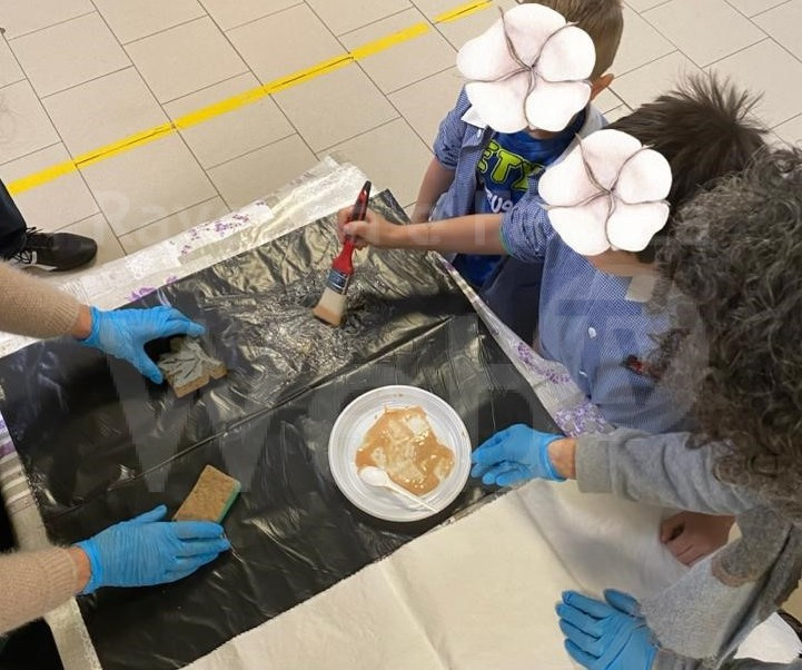 “Al nostro istituto – ricorda Maria Guiati, dirigente scolastica – il signor Luca Argelli, genitore di bambini che hanno frequentato qui la scuola primaria, ha donato due rotoli di tela, appartenuti a sua mamma e da lei tessuti in gioventù. Le nonne hanno lavato i tessuti ed ora con l’aiuto dell’esperto in stampe romagnole Egidio Miserocchi stanno stampando con i bambini le tele. Miserocchi ha portato a scuola il suo colore naturale e i suoi stampi”.