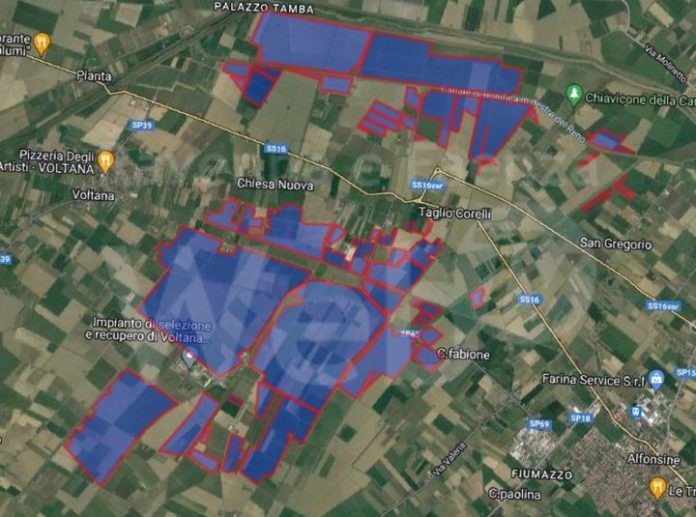 Dalla elaborazione di rilevazioni mediante drone è stata derivata la mappa che allego. Come vedete le aree blu scuro sono quelle in cui attualmente sono confluite le acque di cui si tratta. Quindi le parti maggiormente interessate (nella mappa sono riportate in blu scuro) sono ricomprese in un ideale triangolo tra Fiumazzo, Taglio Corelli e Voltana, oltre che quella a nord sempre di Taglio Corelli, dall’altra parte della ss 16.