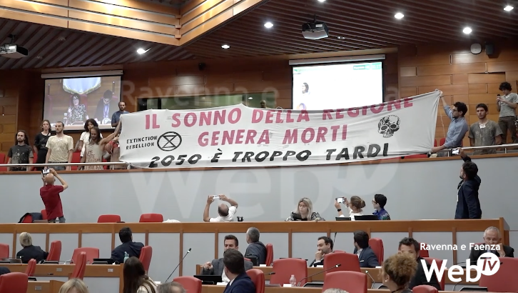 Durante il dibattito in aula è arrivata anche la contestazione degli attivisti di Extinction Rebellion che hanno accusato la Regione di immobilismo.
