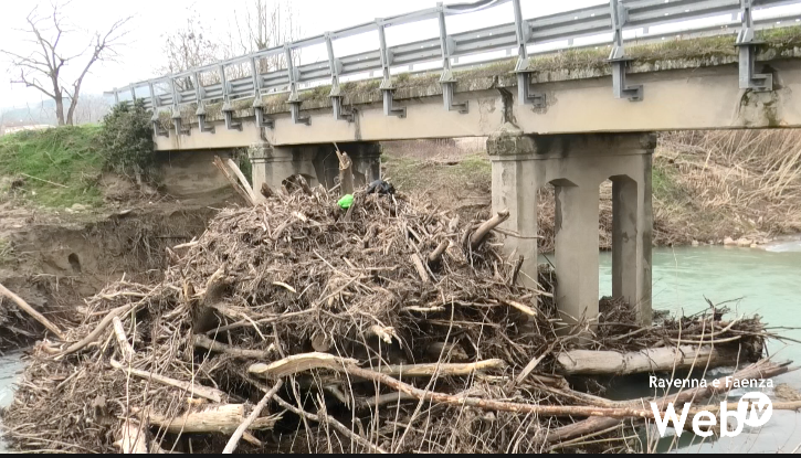 Legname accatastato alla base del ponte sul fiume Lamone in via Mulino del Rosso. Dopo la piena del 28 gennaio scorso, si stanno susseguendo le segnalazioni riguardanti l’alta catasta di legna che si è formata intorno al piccolo manufatto che collega i territori di San Ruffillo e Sarna, fra Brisighella e Faenza.