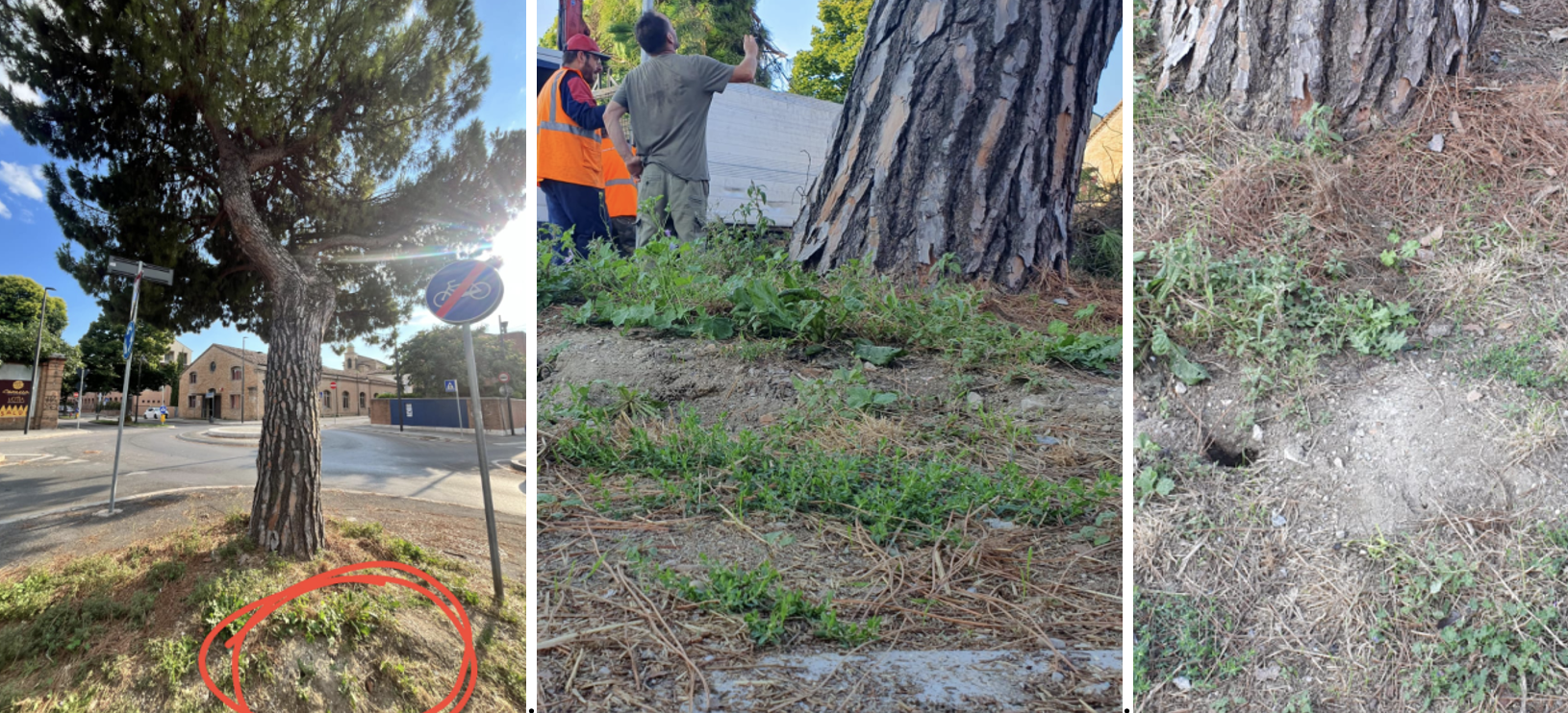 - Via Renato Serra. Nel mese di aprile 2025 sono state eseguite le valutazioni sui 9 pini presenti che sono stati classificati tutti in classe C, compreso quello abbattuto poi all’incrocio di via Pascoli. Pertanto saranno sottoposti a nuova verifica ogni anno. In merito a tale abbattimento, si comunica che nella serata di venerdì 1° agosto abbiamo ricevuto la segnalazione di un cittadino, accompagnata da foto, che mostravano un sollevamento dell’apparato radicale ed una vistosa inclinazione della pianta verso via Pascoli. Dalle foto, è emerso un evidente aumento dell’inclinazione della pianta e uno scollamento dell’apparato radicale. Vista la previsione di temporali previsti per la giornata successiva, che ne avrebbero potuto appesantire la chioma, creando un pericolo per la circolazione e la pubblica incolumità, dopo essermi confrontato con i tecnici di Azimut, ne ho ordinato l’abbattimento per le mattinata successiva dove ho potuto constatare personalmente lo stato dell’apparato radicale. Si allegano in merito le foto della pianta che mostrano gli evidenti segni di scollamento dell’apparato radicale alla base”.