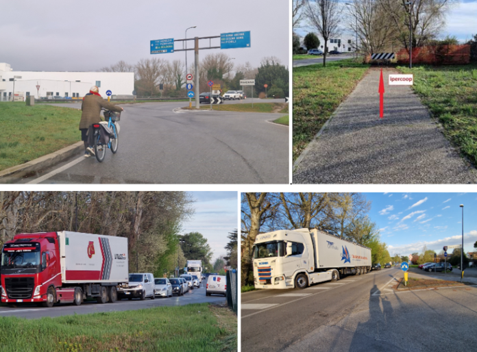 Il problema è che, nel frattempo, a Palazzo Merlato si sono fregati di Borgo Montone, lasciando tal quale via Einstein/rotonda Austria come unico collegamento con quel nuovo mondo scoppiato lì, a 200 metri. Il traffico motorizzato sulla via Einstein è quindi diventato intenso e sfrenato, senza alcuna viabilità alternativa capace di dirottarne una parte e senza una pista ciclopedonale che conduca dal paese in zona ESP coi suoi servizi, connettendosi da lì con la città. Uno sgangherato percorso ad uso dei pedoni e dei ciclisti, parallelo alla via Einstein, è sbarrato, inesorabilmente, a 100 metri dall’ESP.