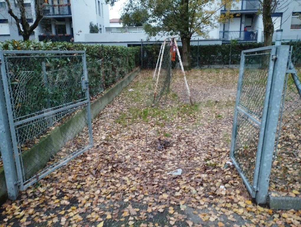 Il cancello di accesso al campo risulta non funzionante a seguito dell’entrata di automezzi intervenuti per effettuare lavori presso un appartamento del complesso condominiale confinante, che probabilmente ne hanno urtato i pali di sostegno. Occorre pertanto provvedere all’immediato ripristino della sua funzionalità, anche al fine di evitare l’ingresso da parte dei cani o di altri animali, ai quali un cartello vieta l’ingresso trattandosi di area giochi.