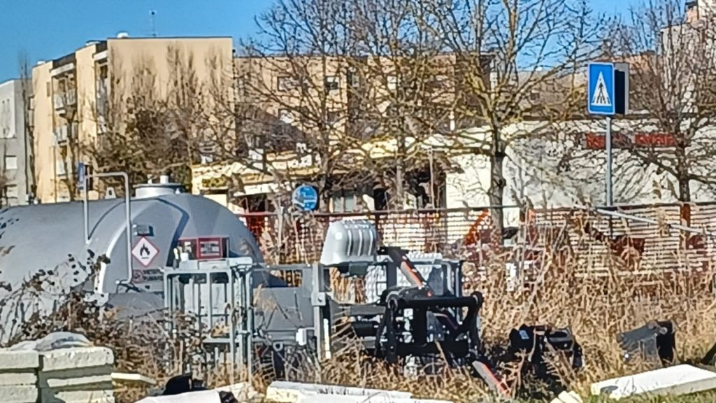 Un anno fa circa, i Vigili del Fuoco, chiamati da un cittadino, intervennero per rimuovere bombole di acetilene collocate lì a grave rischio di sicurezza, trattandosi di un gas altamente infiammabile, che può decomporsi con estrema violenza. Vi era parcheggiata una macchina operatrice, spostata solo qualche mese fa. In mezzo all’erba, giacciono: un serbatoio di gasolio, forse con del contenuto, e il suo bacino di contenimento, forse sporco di residui oleosi; la parte superiore di una piattaforma area di lavoro; pile di pannelli di polistirolo esposti al vento e alla luce solare, soggetti quindi a frantumarsi in mille pezzi infiammabili; grossi sacchi di polipropilene pieni di materiali sconosciuti. Su un lato, barre di tubazioni e curve prefabbricate coibentate. Ed altre brutture. La recinzione, che separa l’area degli edifici comunali da via Marconi e dalla pista ciclopedonale lungo lo scolo Lama, che la fiancheggia a sud, era  stata abbattuta molto tempo fa dal vento senza essere sistemata, lasciando libero accesso a bambini e cani, che avrebbero potuto farsi male, o a malintenzionati per prelevare materiale o dargli fuoco. È stata ripristinata solo la settimana scorsa, anche se facilmente valicabile da adulti.