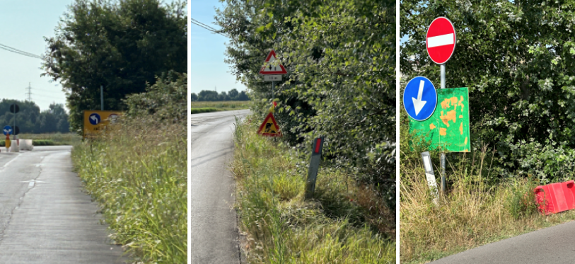 Siccome non c’è mai fondo al degrado, nel frattempo via Stradone è stata abbandonata al peggio. Sono in atto, infatti, i lavori di costruzione di una nuova rotonda tra la vecchia via Antica Milizia e la futura nuova via Stradone con pista ciclabile, che hanno reso però infernale questa strada tra via Destra Canale Molinetto e la rotonda in costruzione. La boscaglia lasciata crescere smisuratamente ai suoi lati nasconde i cartelli di segnalazione di pericolo e di direzione imposti dai lavori in corso. Gente del posto ci suggerisce, con alcune foto, che siano stati inseriti volutamente tra le frasche , con piena consapevolezza che non sarebbero visti dagli automobilisti, data l’altezza sovrabbondante del fogliame selvaggio rispetto al recente inizio dei lavori. In un caso la freccia blu di un cartello con divieto di accesso invita a svoltare nel campo laterale, mostrando anche un new jersey rosso spartitraffico rovesciato fuori strada.