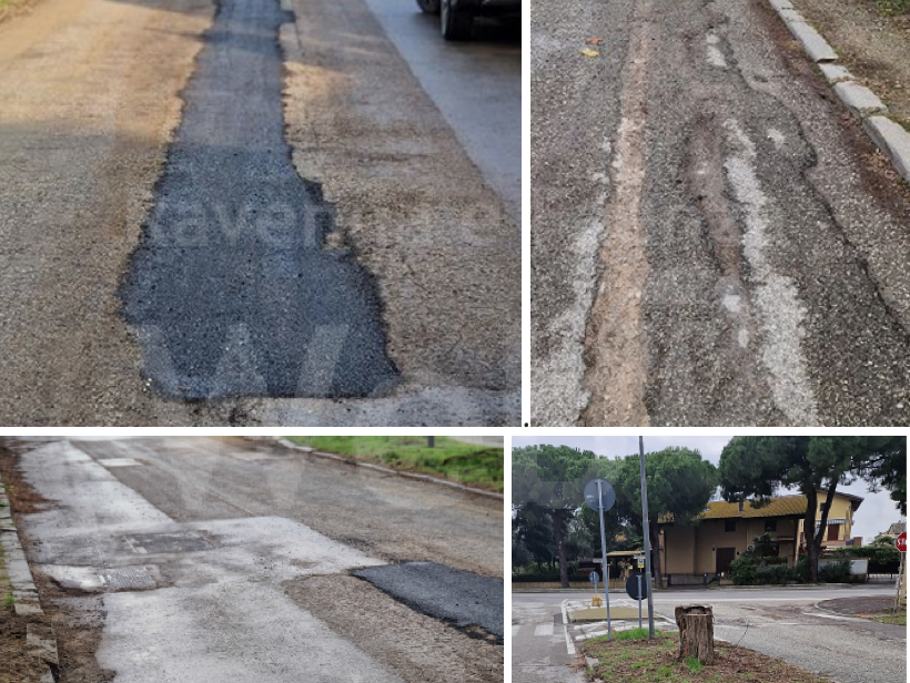 Ne deriva l’estrema pericolosità del fondo stradale, dovuta a svariati dislivelli, buche e prominenze, quasi un rally per le auto, ma soprattutto fonte di insidie e di pericolo per le moto, i ciclomotori, le biciclette e i monopattini. Per non dire dei pedoni, che, a causa del transito malsicuro sui marciapiedi, devono più volte utilizzare la carreggiata. Nelle aiuole spartitraffico sono stati tagliati sette alberi, senza poi effettuare alcun reimpianto, né eliminare i ceppi rimasti.