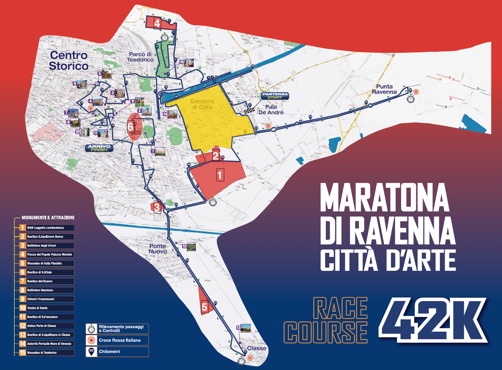 Abbiamo dunque cercato, esaminando la mappa ufficiale della maratona opportunamente ingrandita, di individuare le zone interamente prive di vie d’uscita. Ne è derivato l’inquadramento seguente, dove i numeri in successione corrispondono a quelli che abbiamo inserito su sfondo rosso nella mappa qui pubblicata.