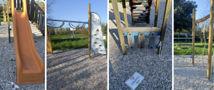 Dopo un sollecito del 4 marzo ed un altro del 1° aprile, ieri, sabato 5 aprile, avendo riscontrato che la situazione era addirittura peggiorata, RDB ha scattato e trasmesso al Comune una serie di foto che dimostra come i giochi risultino coi bandelli stracciati o rimossi, per cui non è chiaro quali siano da rimuovere, quali riparabili, quali da sostituire e quali fruibili.