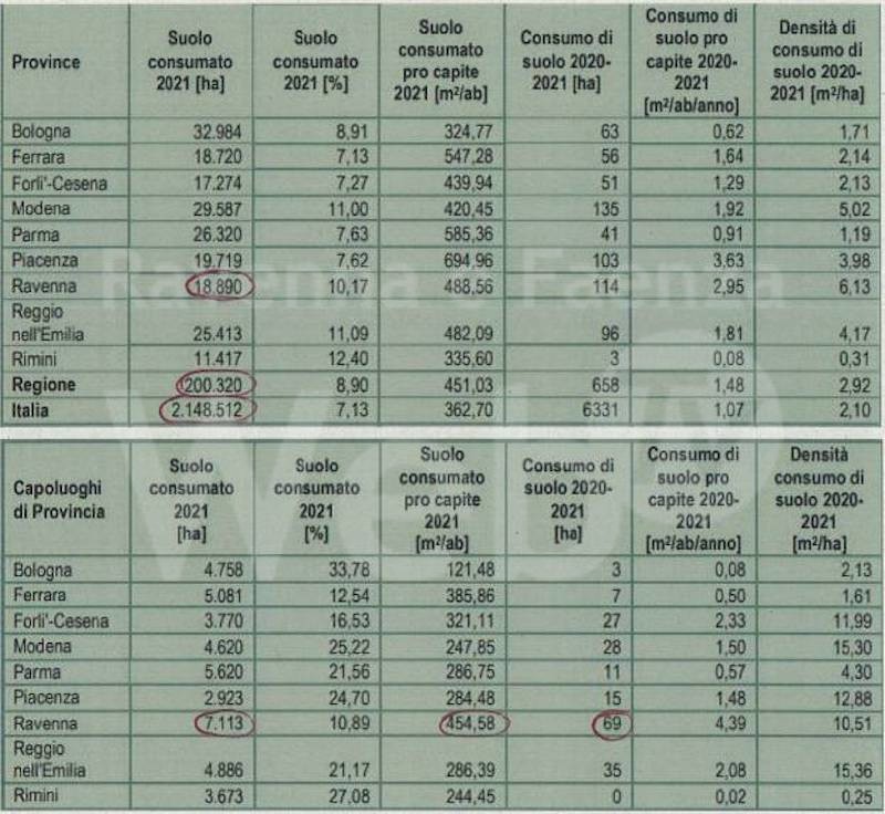 Ed ecco che, nel 2021, la Regione Emilia-Romagna si è classificata al 3° posto in Italia, dopo solo la Lombardia e il Veneto, sia in assoluto che in proporzione all’estensione territoriale, consumando 200.320 ettari di suolo, quasi un decimo di tutta l’Italia. Ravenna svetta al primo posto tra i suoi capoluoghi di provincia con 7.113 ettari, 69 ettari in più che nel 2020 e 454,58 metri quadrati per abitante: dati enormemente superiori a quelli di tutti gli altri capoluoghi, ma sicuramente anche di tutti gli altri Comuni della regione stessa. Fa poco testo la graduatoria delle province emiliano-romagnole, essendone quella di Ravenna la più piccola (e la 74.a tra le 107 d’Italia), nella quale, comunque, il Comune di Ravenna ha “bruciato” da solo nel 2021 quasi la metà di quanto consumato nell’intera sua provincia (18.890 ettari).