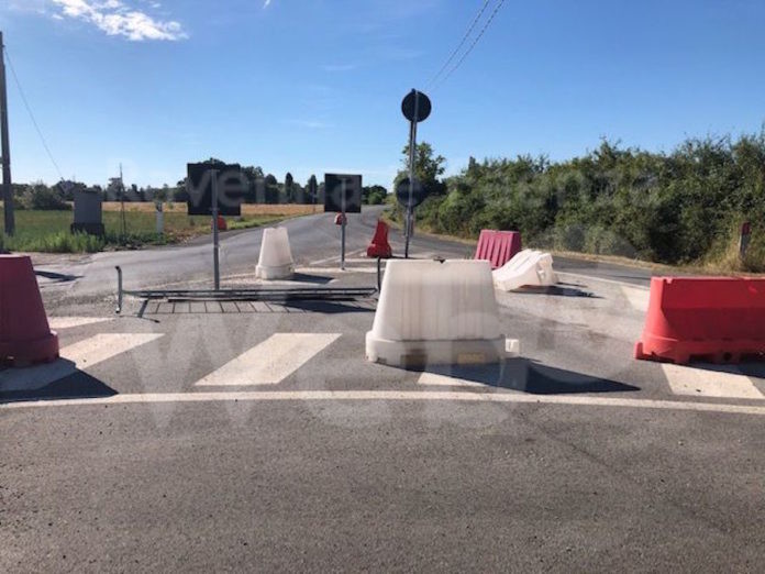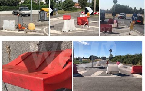 - All’inizio e alla fine del tratto a senso unico, da via Canale Molinetto all’intersezione con via Casadei, le transenne in plastica di segnalazione della carreggiata, vuote e/o rotte, si spostano con il vento e invadono la carreggiata, su cui pende pericolosamente, da mesi, anche un cartello stradale malfermo. In via Casadei, all’incrocio con via del Liscio, c’è lo stesso abbandono delle transenne, di cui peraltro non si comprende l’utilità.