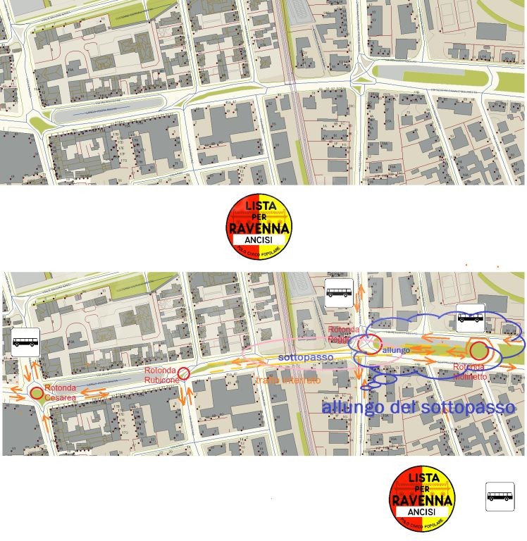 Per superare d’un colpo tutti questi imbottigliamenti, la petizione chiedeva di esaminare la fattibilità di due rotonde da porre rispettivamente sulle vie Rubicone e dei Poggi, in modo che le due arterie restassero a doppio senso come ora. In sede di verifica, risultò che la rotonda su via dei Poggi, essendo troppo a ridosso dell’entrata/uscita del sottopasso, oltreché di ardua realizzazione, non avrebbe consentito al traffico proveniente dalla Circonvallazione piazza d’Armi di svoltare in direzione mare, mostrandosi quindi inadeguata. Nel marzo 2023, uno studio commissionato da Lista per Ravenna, oltre ad avanzare la proposta di tre rotonde, rispettivamente sulle via Rubicone, Cesarea e dei Poggi, riorganizzando di conseguenza l’impianto circolatorio dell’intera viabilità movimentata dal sottopasso, dimostrò come occorresse allungare il sottopasso dal lato mare di circa 110 metri, fino all’altezza di via Tagliamento, in modo da porre la nuova rotonda Molinetto 130 metri più avanti, all’altezza dell’attuale svincolo di via Destra Canale Molinetto verso via Bellucci, lato ippodromo (vedi la planimetria di cui sopra).