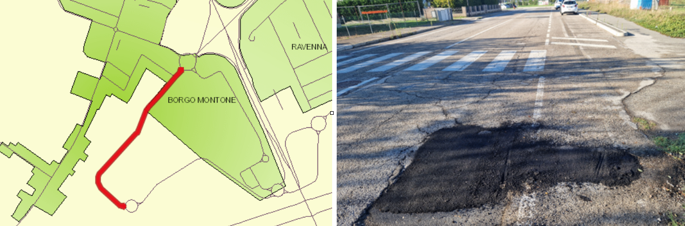 Questa strada è comunque di proprietà del Comune di Ravenna. Lo si può vedere da come è stata effettuata e tollerata una riparazione straziante della pavimentazione. Una cittadina ravennate residente nell’unica strada di Borgo Montone che confluisce in via Bussato, ce ne ha mandato la foto sabato scorso, descrivendola così: “L’asfalto (se così si può chiamare) non è stato messo bene e inoltre non si è consolidato: in questo modo è già danneggiato e pericoloso per biciclette e pedoni”. Al cosiddetto “Global service”, gestito dal servizio Strade del Comune di Ravenna, appaltato alla società cooperativa Sistema 3.2 al costo, per il triennio 2023-2025, di 13,5 milioni di euro per gli interventi ordinari e di altri 7,5 per ulteriori progetti, spetta “la manutenzione ordinaria o preservativa della rete stradale e relative pertinenze e componenti, nonché il mantenimento e ripristino delle normali condizioni di viabilità, ecc.”. Il Comune ha il compito di vigilare sulla correttezza dei lavori, da compiersi a regola d’arte, e sulle inadempienze al contratto di servizio, applicando nel caso le dovute sanzioni.
