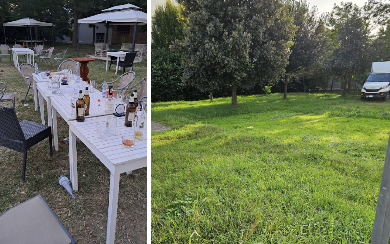 Lasciamo ora la parola alla rendicontazione, prodotta dalla Polizia Locale il 30 ottobre scorso, sulle attività ispettive e di ripristino svolte presso l’area in questione, sintetizzandola così: fino al 21 giugno, i sopralluoghi effettuati hanno riscontrato “una reiterata eccedenza rispetto ai 60 mq concessi […] mediante l’installazione di strutture quali gazebi, tavolini, sedie, ombrelloni e persino un tavolo da ping pong, tutte installazioni non previste nel titolo concessorio”, nonché “violazioni dell’art. 666 del codice penale in relazione all’art. 68 del Testo Unico di Pubblica Sicurezza, poiché venivano organizzati trattenimenti musicali danzanti e DJ Set senza le dovute autorizzazioni”. Dopo i divieti imposti col provvedimento del 5 luglio, sono state rilevate “ulteriori violazioni per l’occupazione abusiva di una superficie eccedente i limiti concessi, con installazioni non autorizzate”. Dopo la suddetta decadenza della concessione disposta il 2 settembre, “in data 4 ottobre, il sig. Gardini veniva nuovamente sollecitato a rimuovere tutte le strutture abusivamente installate all’interno dell’area verde”. Infine, “in data 28 ottobre 2024 veniva effettuato un ulteriore sopralluogo, durante il quale si accertava la completa rimozione delle piastrelle e il ripristino dello stato dei luoghi”.