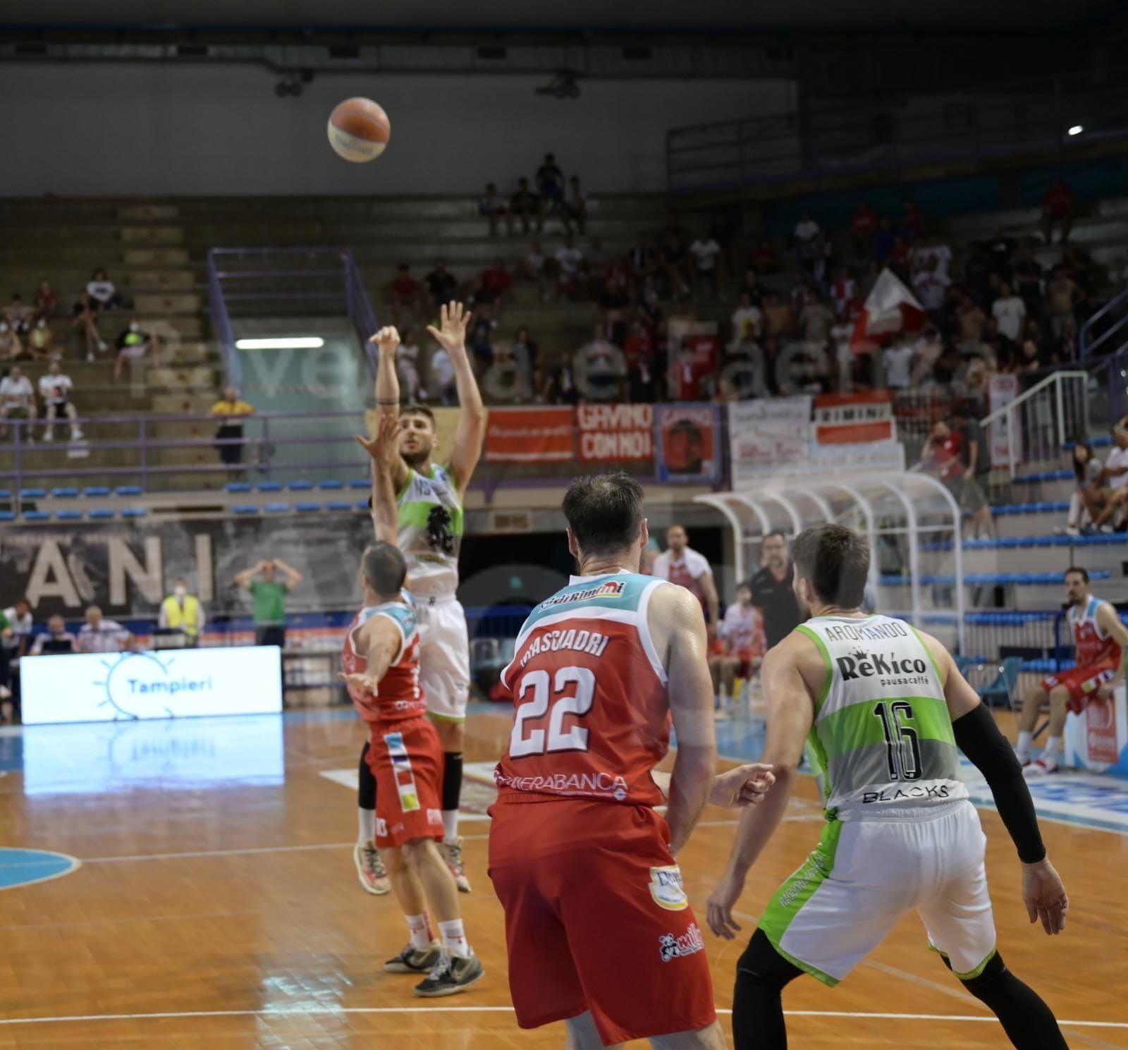 Poi però salgono in cattedra Tassinari e la difesa riminese e i Raggisolaris non riescono più a segnare: ben presto sono gli ospiti a passare a comandare. Il sorpasso e l’allungo valgono il 62-55 di fine terzo quarto poi la RivieraBanca tocca anche il 72-62 a 5’ dal termine in una fase di gara dove regna il nervosismo. Sembra finita ma i Raggisolaris si riprendono prepotentemente l’inerzia trovando con Molinaro a 5’’ dalla fine la tripla dell’80-80. Tassinari viene poi ben marcato nell’azione finale e così si arriva al supplementare.