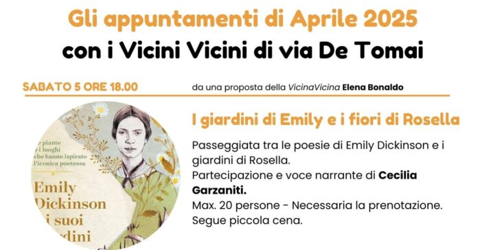 Anche nel mese di aprile le iniziative de i “Vicini Vicini di via de Tomai” proseguono con i consueti incontri nel fine settimana dedicati alla cucina e all’arte. Sabato 5 aprile alle 18 ci sarà l’incontro dedicato alla letteratura “I giardini di Emily e i fiori di Rosella”, una passeggiata tra le poesie di Emily Dickinson e i giardini di Rosella, voce narrante Cecilia Garzanti. Necessaria la prenotazione, massimo 20 persone. Seguirà una piccola cena. Domenica 6, alle 12,30 a casa di Rosella, “Il pranzo della domenica” per sostenere il progetto solidale Piatto Sospeso e nel pomeriggio dalle 16 alle 19 si potrà partecipare a “La cucina delle regioni-cosa c’è in frigorifero”, corso di cucina tipica regionale per esplodere i diversi sapori dell’Italia, a cura dell’Associazione scuola di cucina “Saperi e sapori”. Al termine si assaggeranno i piatti autoprodotti. Prenotazione obbligatoria, massimo 10 persone. Le iniziative sono aperte a tutta la cittadinanza su prenotazione entro venerdì 4 aprile al numero di Rosella Mengozzi – 348 153 9975.
