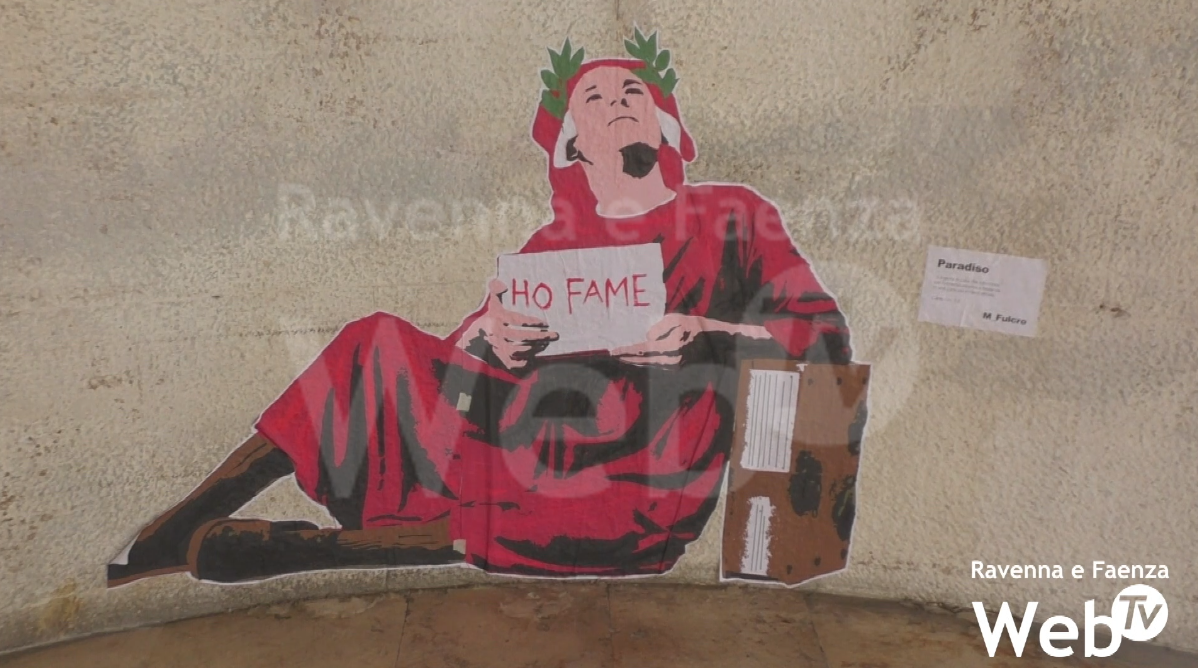 Lo street artist M Fulcro torna a Ravenna con tre nuovi poster che mostrano un Dante che appare ben lontano dalle classiche illustrazioni a cui siamo abituati. L’artista ha infatti scelto di rappresentare in maniera provocatoria il Sommo Poeta prima come un mendicante, circondato da angeli che rappresentano il “paradiso” consumistico che caratterizza la nostra società, poi come un fuorilegge braccato da due poliziotti e infine in attesa di ricevere il vaccino anti-Covid. Purtroppo quest’ultimo poster è stato rimosso, ma è ancora possibile trovare gli altri due in via Corrado Ricci e alla base della Torre Civica in centro a Ravenna.