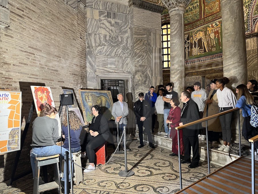 Il Preside del Liceo Artistico prof Gianluca Dradi ringrazia i rappresentanti della Curia Arcivescovile per l’opportunità offerta ai ragazzi della scuola di misurarsi con la sacralità del luogo attraverso una performance che li vedrà protagonisti del laboratorio di mosaico in diretta, sotto lo sguardo curioso di turisti e visitatori. (periodicamente, ingresso incluso nel biglietto Opera di Religione, dal 10 ottobre al 27 novembre 2022, gratuità per i residenti del Comune di Ravenna).