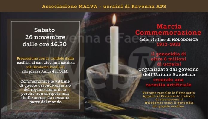 “Quest’anno cade la 90° ricorrenza di Holodomor, ovvero sterminio per la fame, la carestia provocata dall’URSS di Stalin che colpì l’Ucraina tra il 1932 e il 1933, causando 6 milioni di morti. Nostra Associazione “Malva” – ucraini di Ravenna APS si unisce alla COMMEMORAZIONE delle vittime di HOLODOMOR e SABATO 26 NOVEMBRE vi invita a partecipare alla MARCIA fiaccolata con partenza alle ore 16:30 dalla Basilica di San Giovanni Battista, Via Girolamo Rossi, 45 verso piazza Anita Garibaldi.
