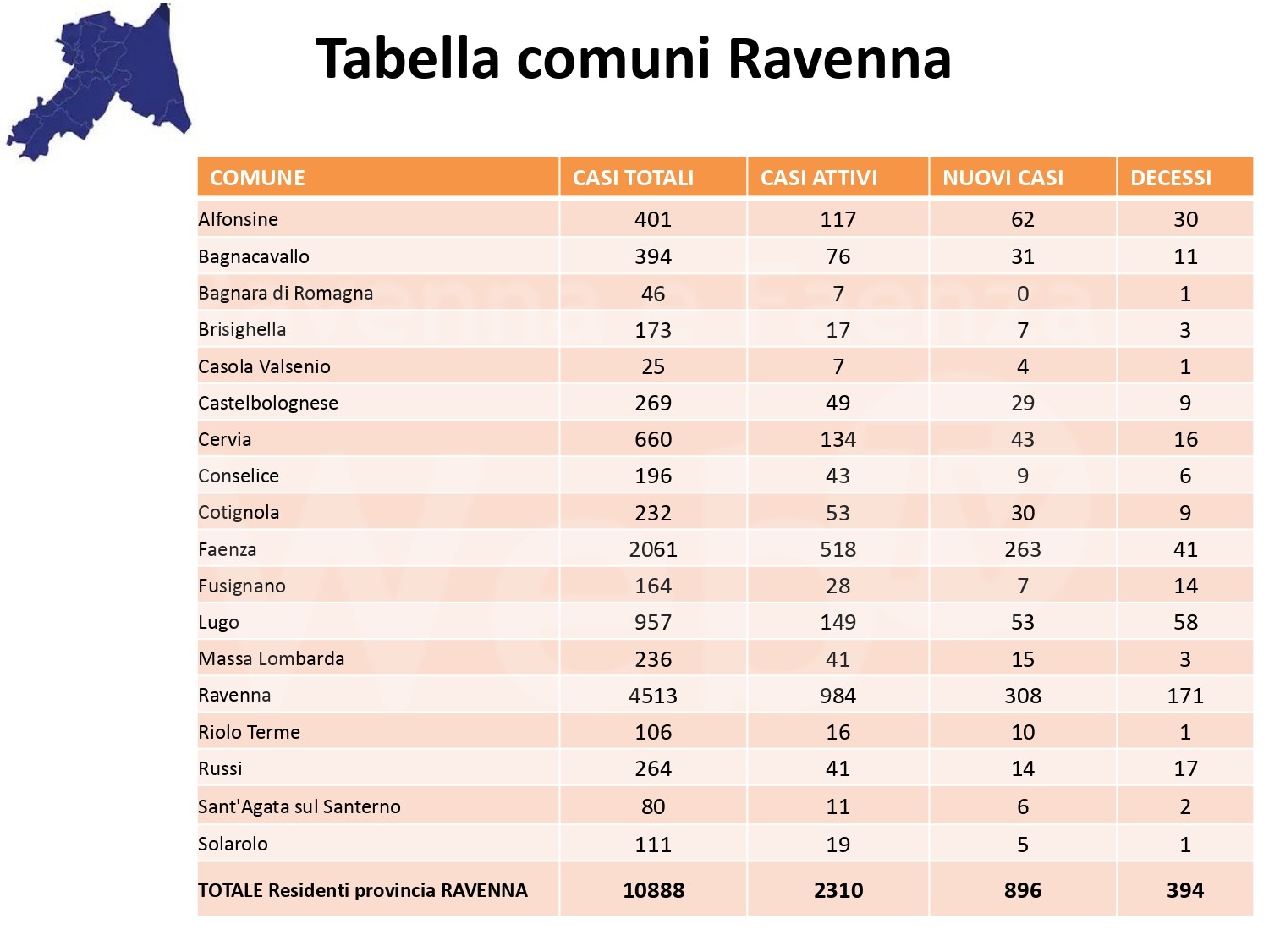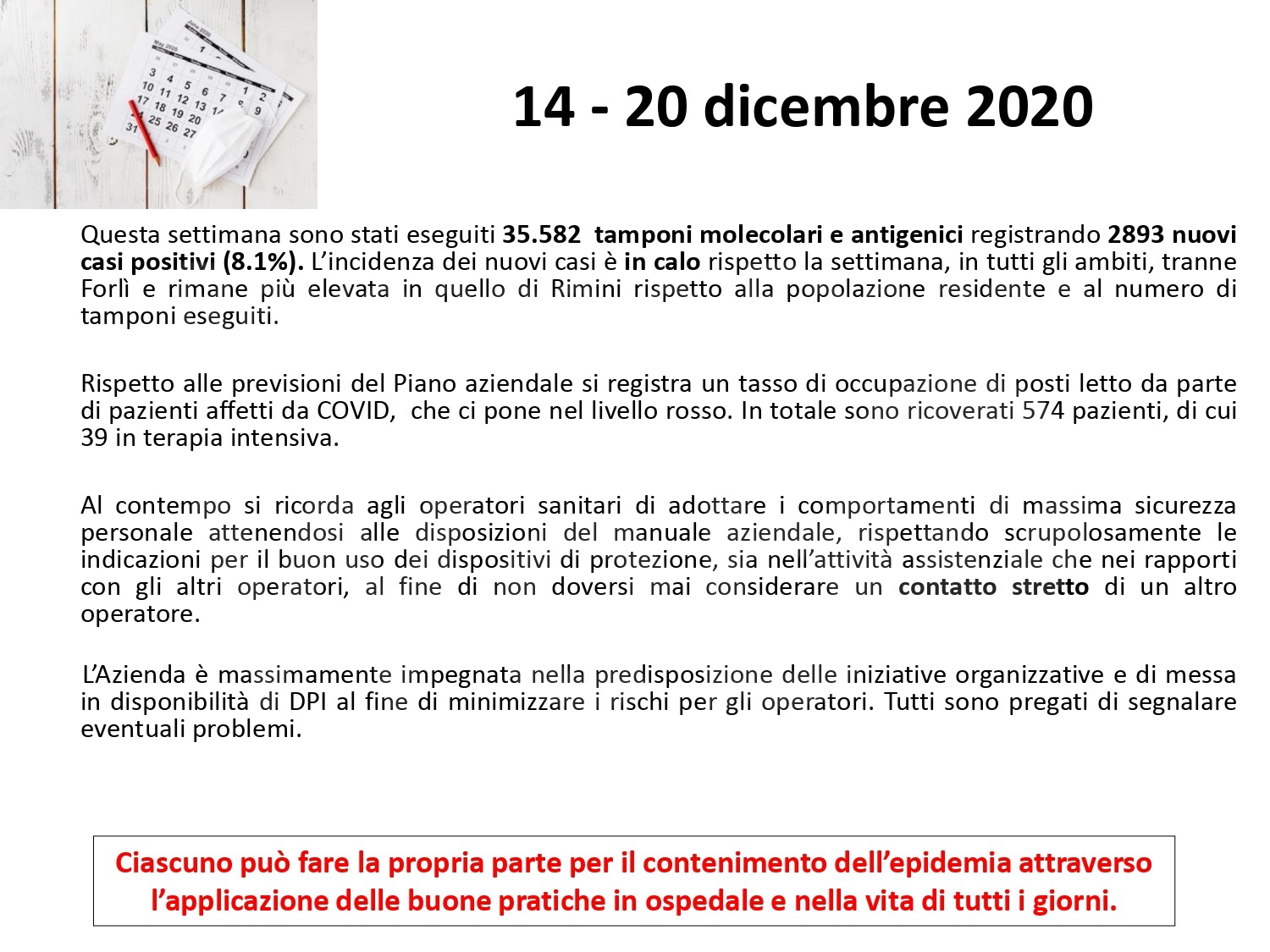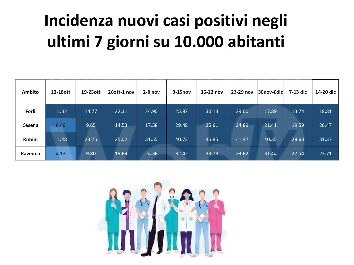 Al fine di fornire un aggiornamento rispetto all’evoluzione del quadro epidemiologico dell’infezione da covid 19 nel territorio romagnolo, su un arco temporale più significativo rispetto alla situazione di una singola giornata, si riportano, in allegato, alcuni dati relativi alla settimana dal 14 al 20 dicembre (precisando che si tratta dei casi di residenti diagnosticati sul territorio romagnolo).