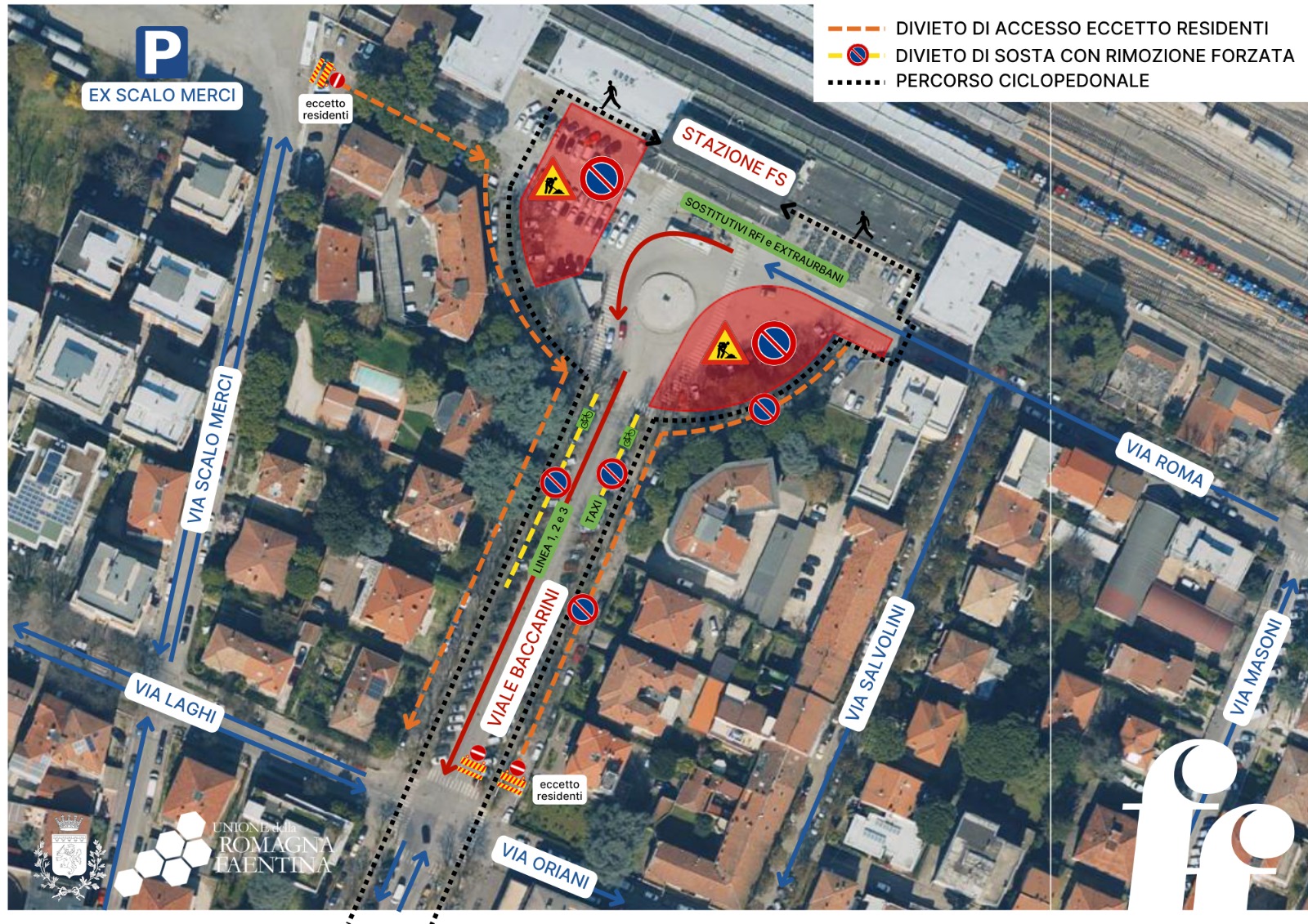 Durante il periodo indicato, in Piazza Cesare Battisti sarà istituito il divieto di sosta con rimozione forzata. Nella carreggiata centrale di Viale Baccarini, tra il piazzale della stazione ferroviaria e Via Oriani/Laghi, verrà istituito il senso unico di marcia con direzione Ravenna-Firenze (dalla Stazione FS verso il centro città).