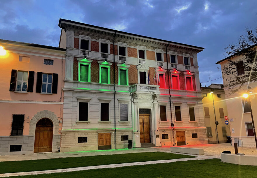Nei giorni scorsi i principali impianti idraulici o i luoghi più rappresentativi dei Consorzi di bonifica e irrigazione lungo tutta la Penisola sono stati illuminati di tricolore, nell’ambito dell’iniziativa “Bagliori nella notte”, promossa da ANBI – Associazione Nazionale Consorzi di gestione e tutela del territorio e acque irrigue. Per l’occasione, il Consorzio di bonifica della Romagna Occidentale ha scelto di illuminare la propria sede centrale, nella caratteristica Piazza Savonarola, nel centro storico di Lugo.