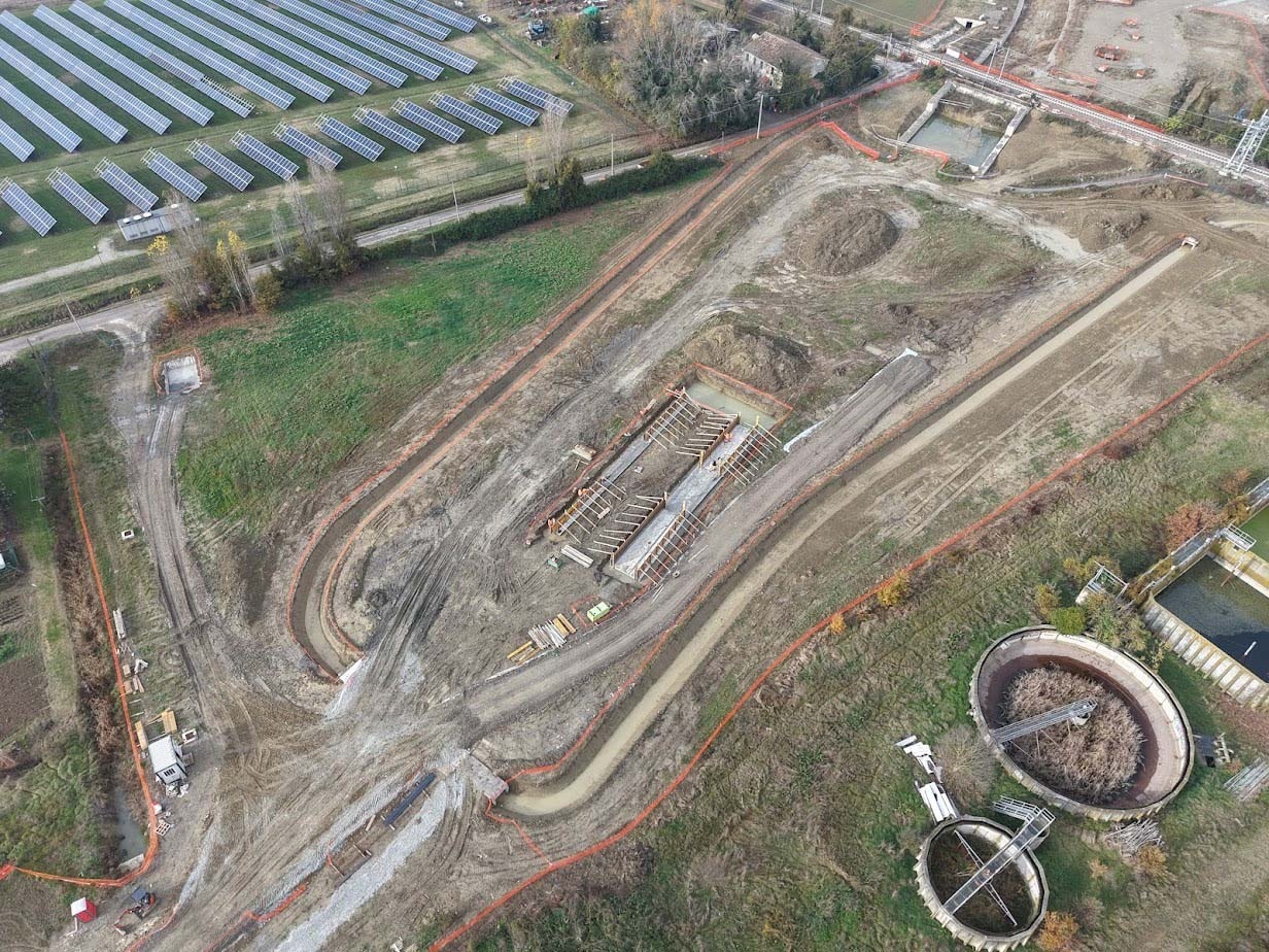 Dopo la conclusione della rotatoria di via Fornazzo, nelle ultime settimane il cantiere si è concentrato sul completamento della rotatoria intermedia e della relativa viabilità interna, oltre che sulle opere idrauliche per la deviazione del canale Zani. Sono inoltre iniziate le attività di realizzazione delle rampe di accesso al monolite che costituirà la struttura del sottopassaggio ferroviario.