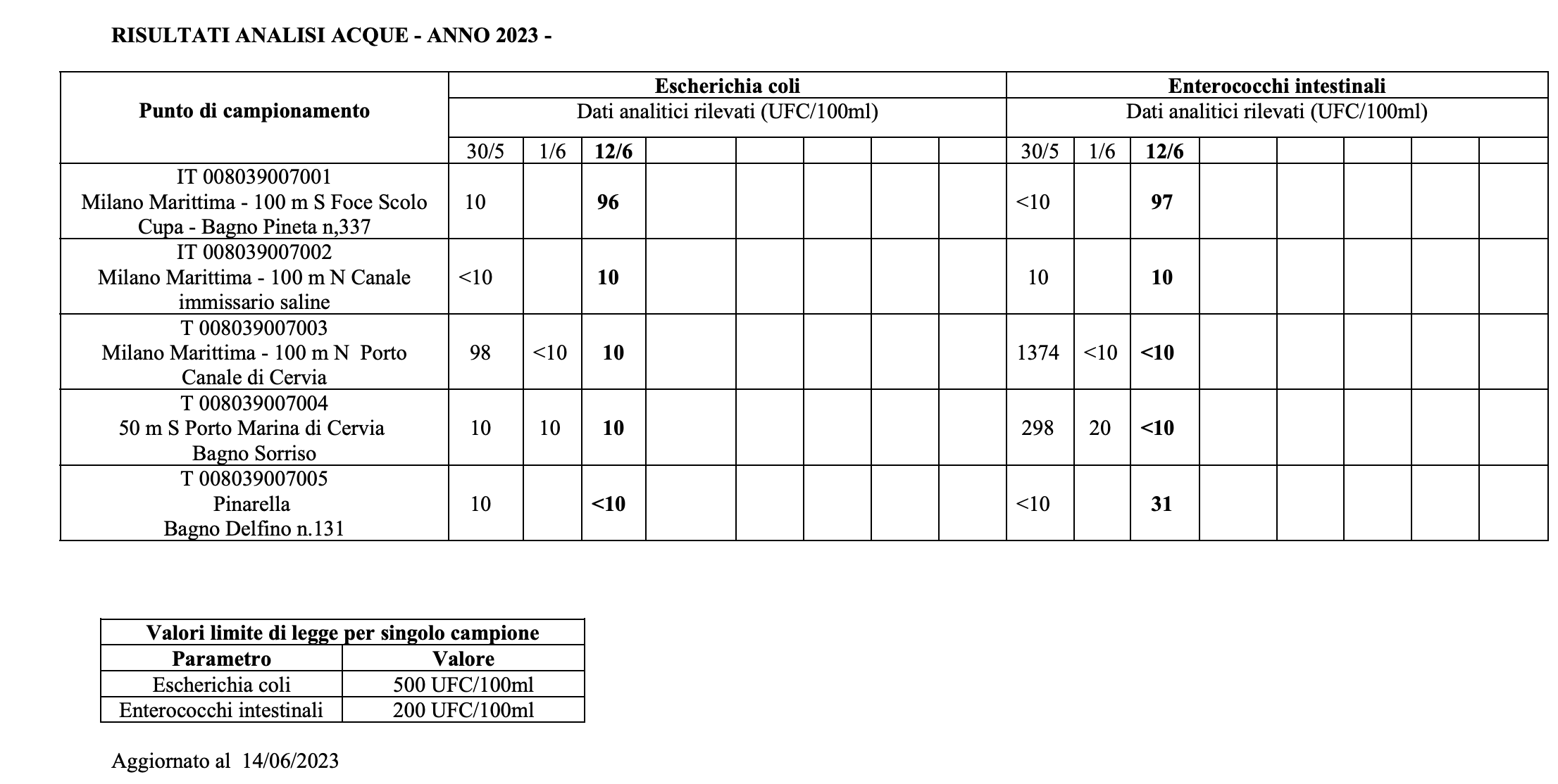I risultati dei prelievi nel litorale di Cervia il 12 giugno 2023 hanno classificato le acque di balneazione di qualità “eccellente” e “buona”.