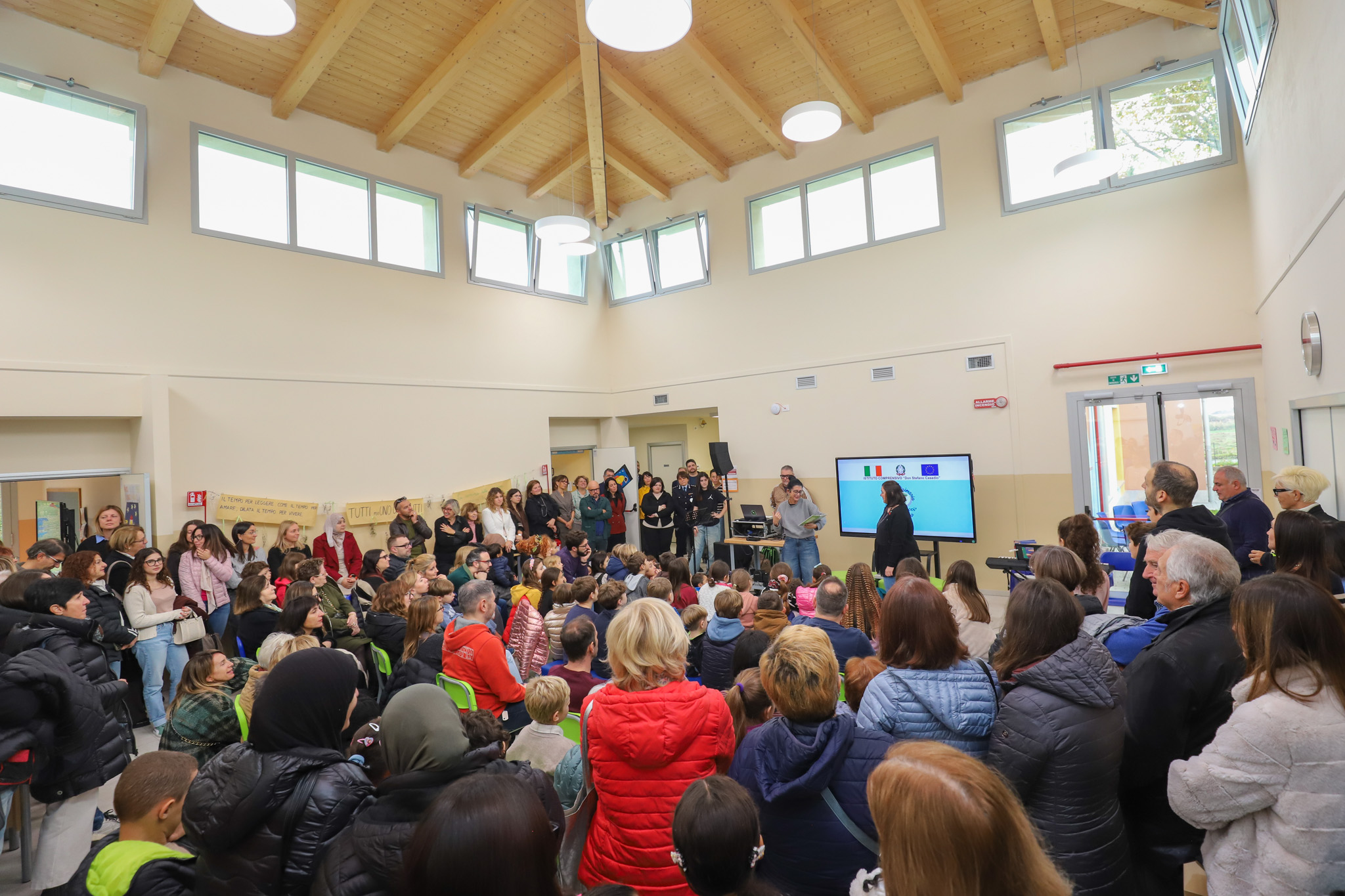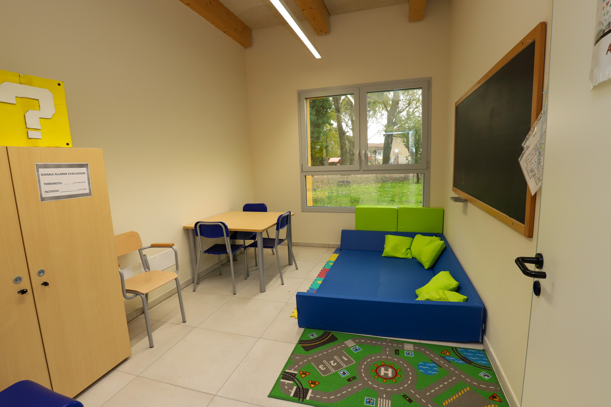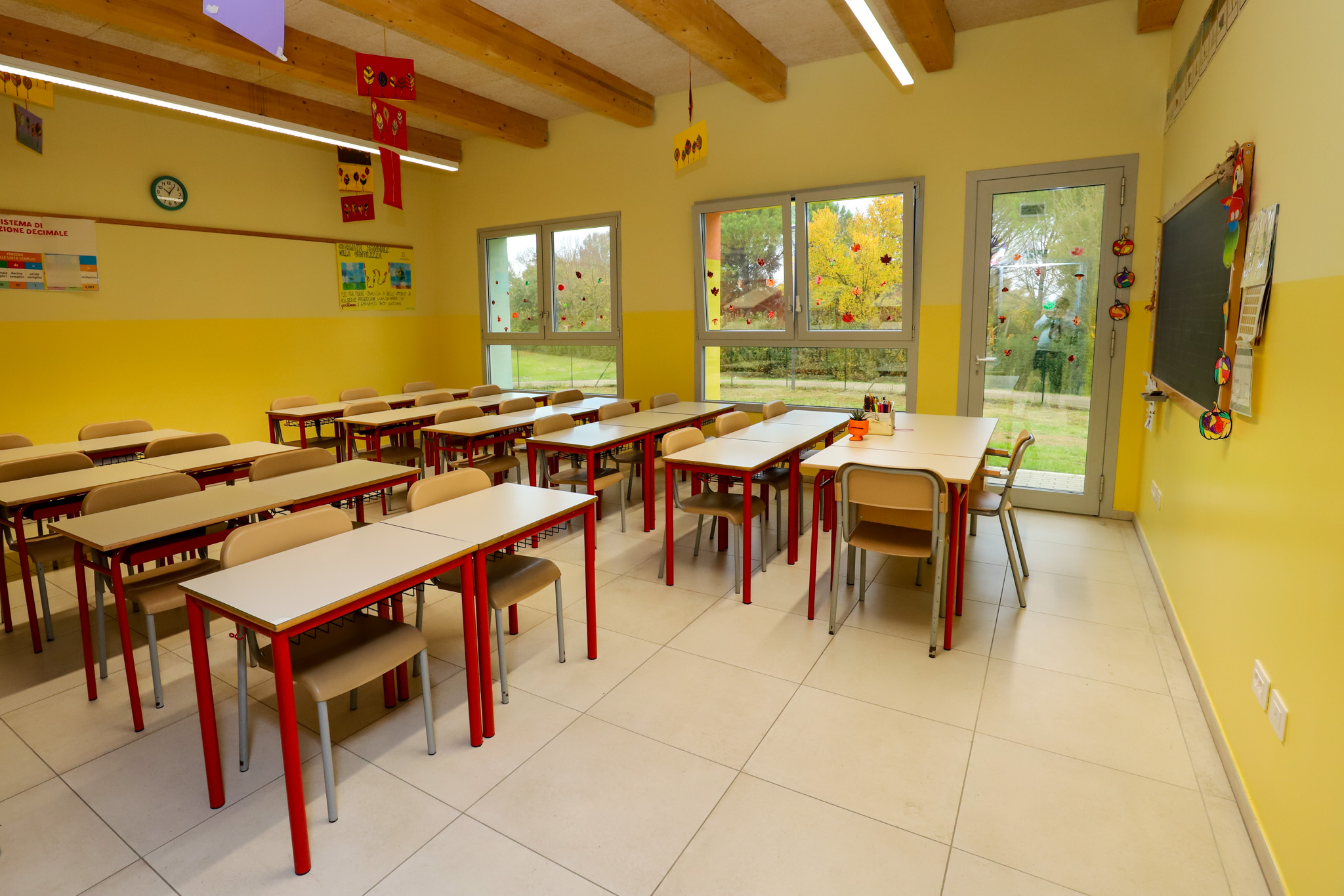La nuova scuola è dotata di cinque aule di circa 40 mq l’una, una mensa pensata per accogliere contemporaneamente tutti gli studenti, un atrio utilizzabile come spazio polivalente, un’aula informatica con biblioteca, un’aula insegnanti, un’aula morbida, un deposito e uno spazio per lo sporzionamento del cibo.