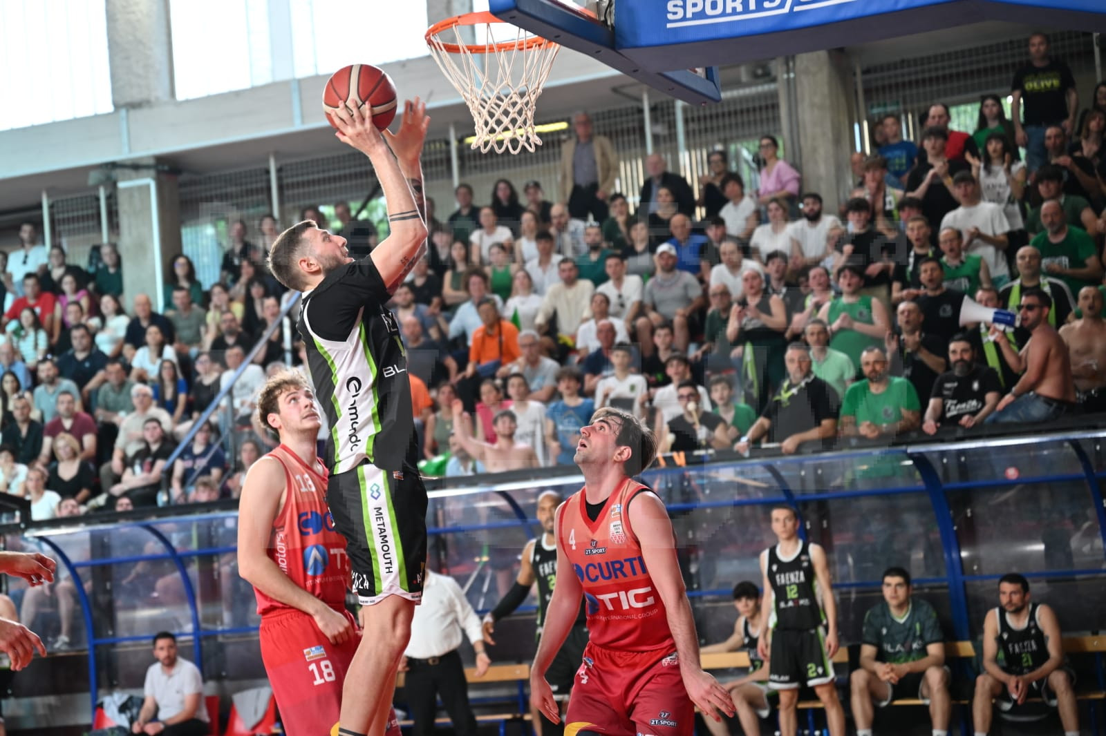 In un PalaRuggi caldo e con il tifo alle stelle, è l’Andrea Costa a partire meglio portandosi sul 16-5. Faenza reagisce con la difesa e il gioco di squadra e alla fine del primo quarto arriva a due sole lunghezze dagli avversari (22-24). L’inerzia non cambia nel secondo periodo di gioco ed è Begarin con una schiacciata a firmare il break di 14-0 per il 29-24. Imola si affida alle giocate dei singoli, ma i Blacks rispondono sempre ai tentativi di rimonta, anche se nel finale di primo tempo hanno un piccolo calo permettendo agli imolesi di arrivare al riposo sotto 41-45.