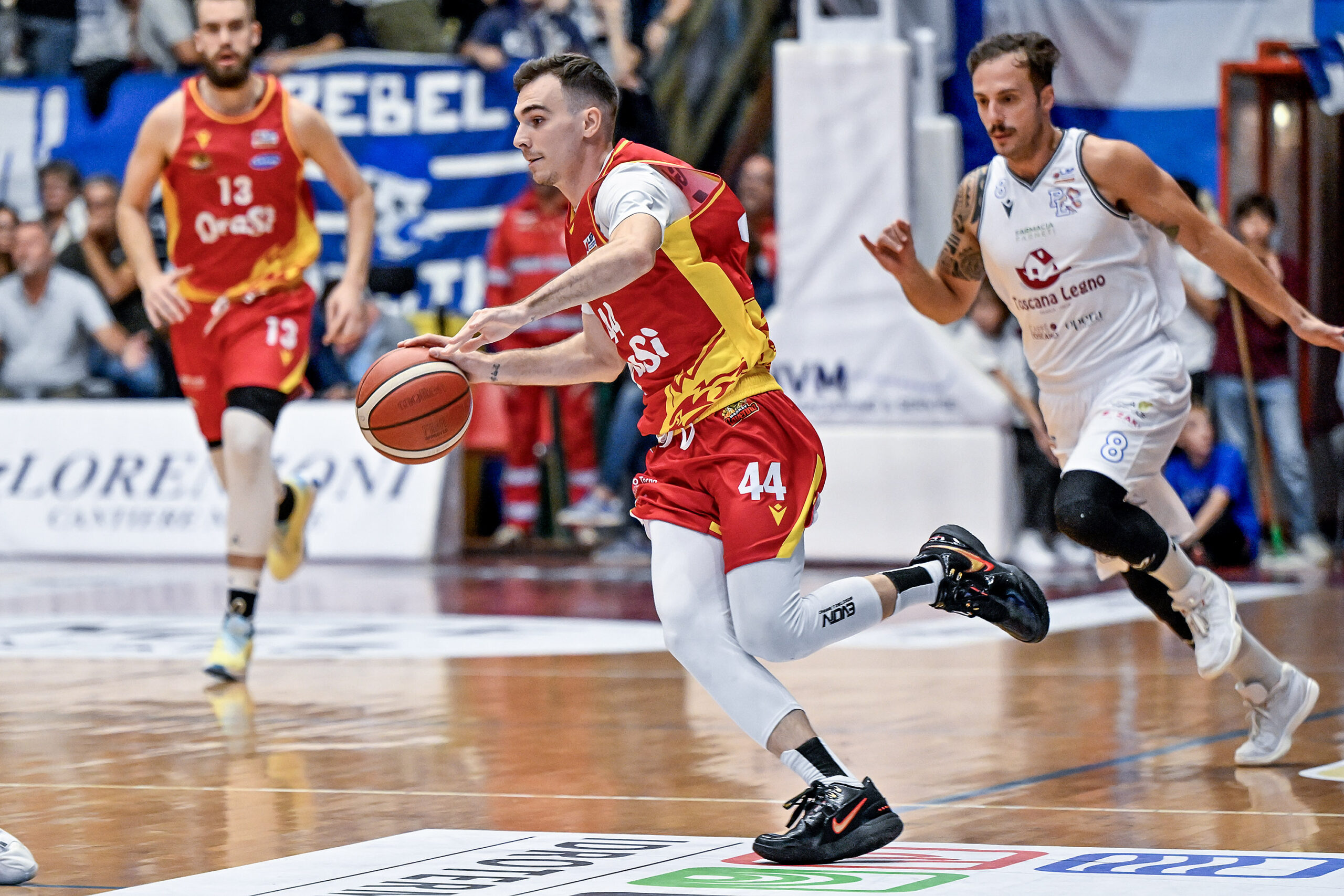 Il secondo periodo si apre con una sfida tra le due squadre da dietro l’arco, con le triple di Casoni e Gay a rispondere a quelle dei biancoblu. A 3 minuti dall’intervallo, le due squadre pagano la grande intensità raggiungendo entrambe il bonus, anche grazie alle incursioni di Gay da una parte, e di Leonzio dall’altra. I giallorossi non smettono di attaccare il canestro e, grazie anche all’ottima difesa di squadra, riescono a finire il primo tempo in vantaggio, sul punteggio di 30-31.
